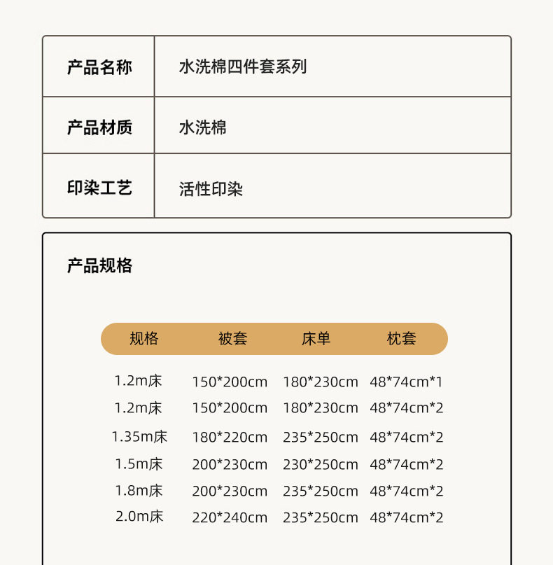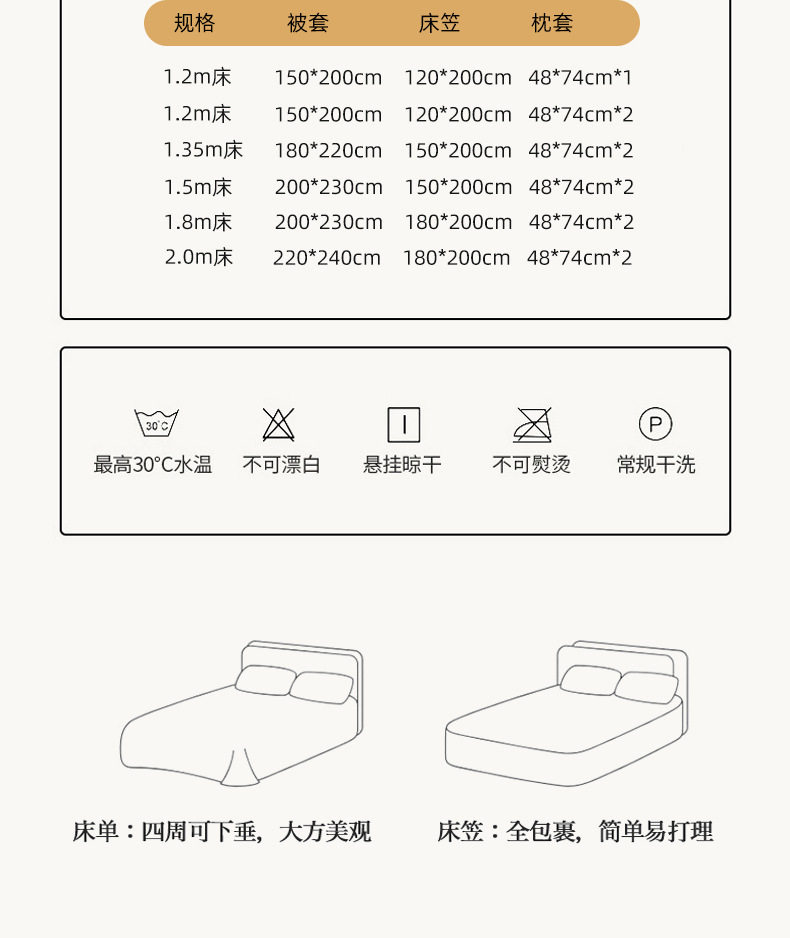 | Dimensions | 1.2m bed sheet three-piece set [150*200cm quilt cover, 180*230cm pillowcase, 1 piece] [no pilling and no fading],1.5m bed sheet four-piece set [150*200cm quilt cover, 180*230cm pillowcases, 2 pieces] [no pilling and no fading],1.8m bed sheet four-piece set [quilt cover 180*220cm bed sheet 230*230cm pillowcase 2 pieces] [no pilling and no fading],2.0m bed sheet four-piece set [quilt cover 200*230cm bed sheet 230*230cm pillowcase 2 pieces] [no pilling and no fading],2.2m bed sheet four-piece set [quilt cover 220*240cm bed sheet 235*245cm pillowcase 2 pieces] [no pilling and no fading],1.5m fitted sheet set of four [quilt cover 150*200cm] [no pilling and no fading],1.5m fitted sheet set of four [quilt cover 200*230cm] [no pilling and no fading],1.8m fitted sheet set of four [quilt cover 180*220cm] [no pilling and no fading],1.8m fitted sheet set of four [quilt cover 200*230cm] [no pilling and no fading],150*200cm [single quilt cover] [no pilling or fading],180*220cm [single quilt cover] [no pilling or fading],200*230cm [single quilt cover] [no pilling or fading],220*240cm [single quilt cover] [no pilling or fading],One 48*74cm pillowcase [no pilling or fading] |
