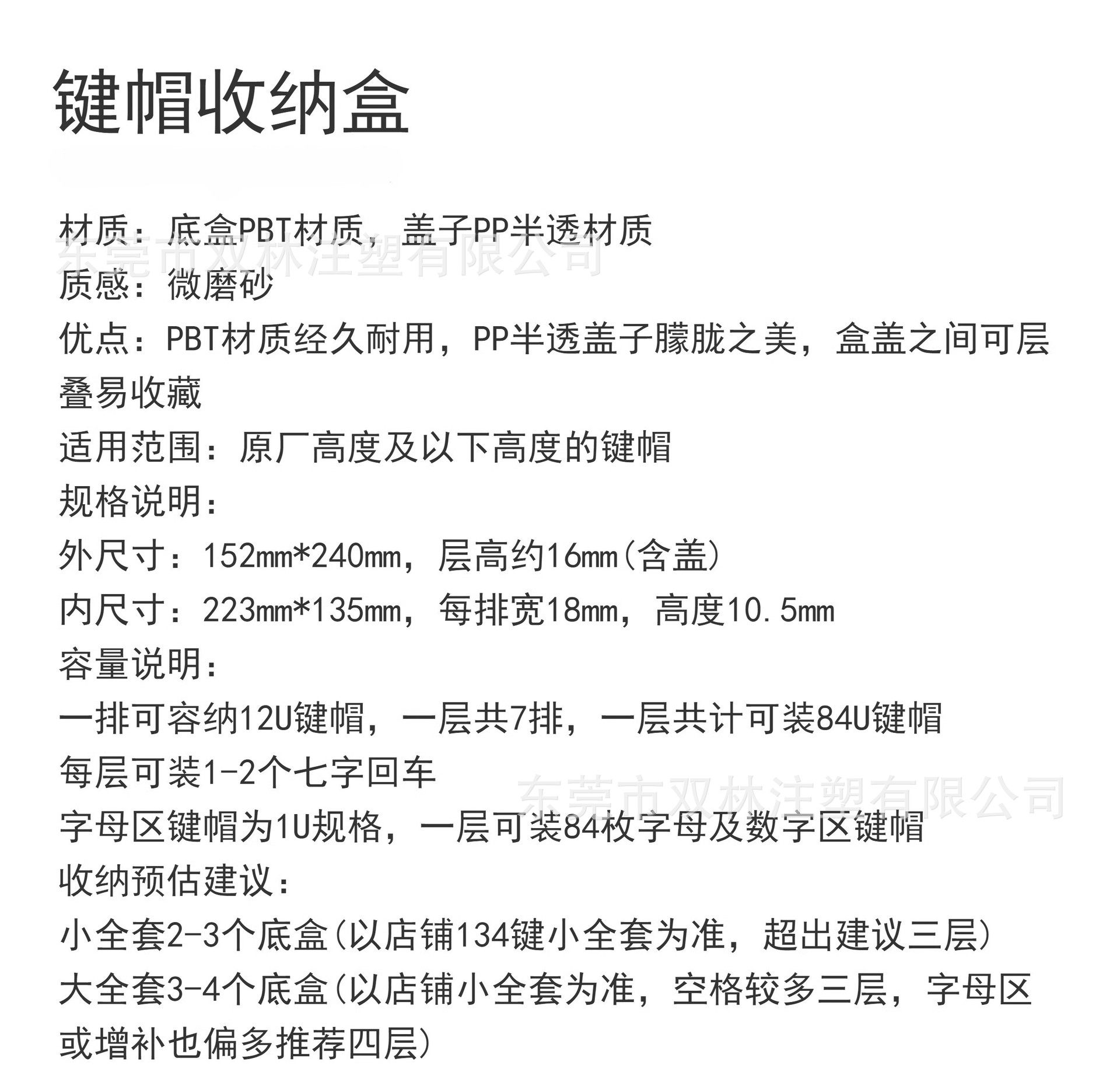 | Color | White translucent lid,Black semi-transparent lid,Pbt injection molded black box 1 layer,Pbt injection molded white box 1 layer,Pbt injection molded green box 1 layer,Pbt injection molded pink box 1 layer,Pbt injection molded yellow box 1 layer,Pbt injection molded orange box 1 layer,Pbt injection molded pink box 1 layer,Pbt injection molded sky blue box 1 layer,Pbt injection molded earth gray box 1 layer,Pbt injection molded red box 1 layer,Support customized colors,Wholesale price negotiation and shipping fee change |