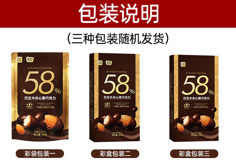 | Packaging specifications | 58% dark chocolate [about 21 bags] almond chocolate beans 80g/bag,Rich and crispy [about 42 bags] almond chocolate beans 80g*2 bags,Melt in your mouth [about 63 pieces] almond chocolate beans 80g*3 packs,[about 105 pieces] almond chocolate beans 80g*5 bags |