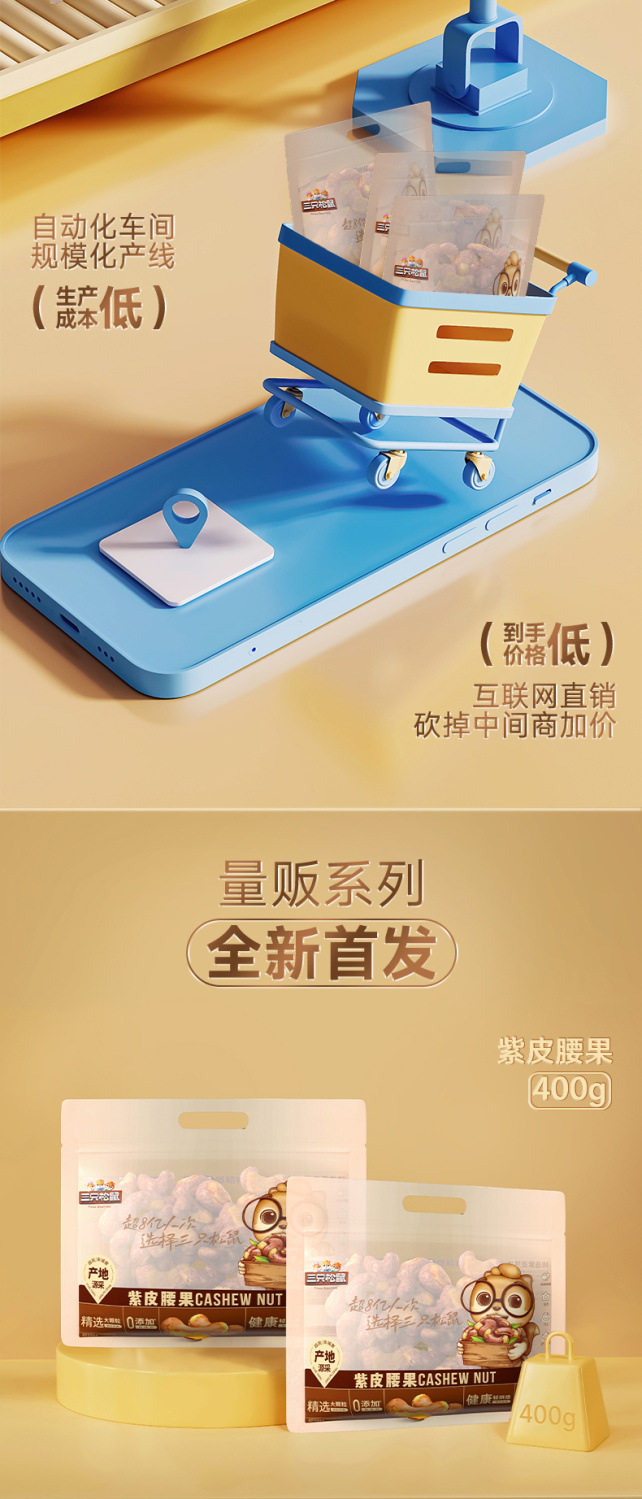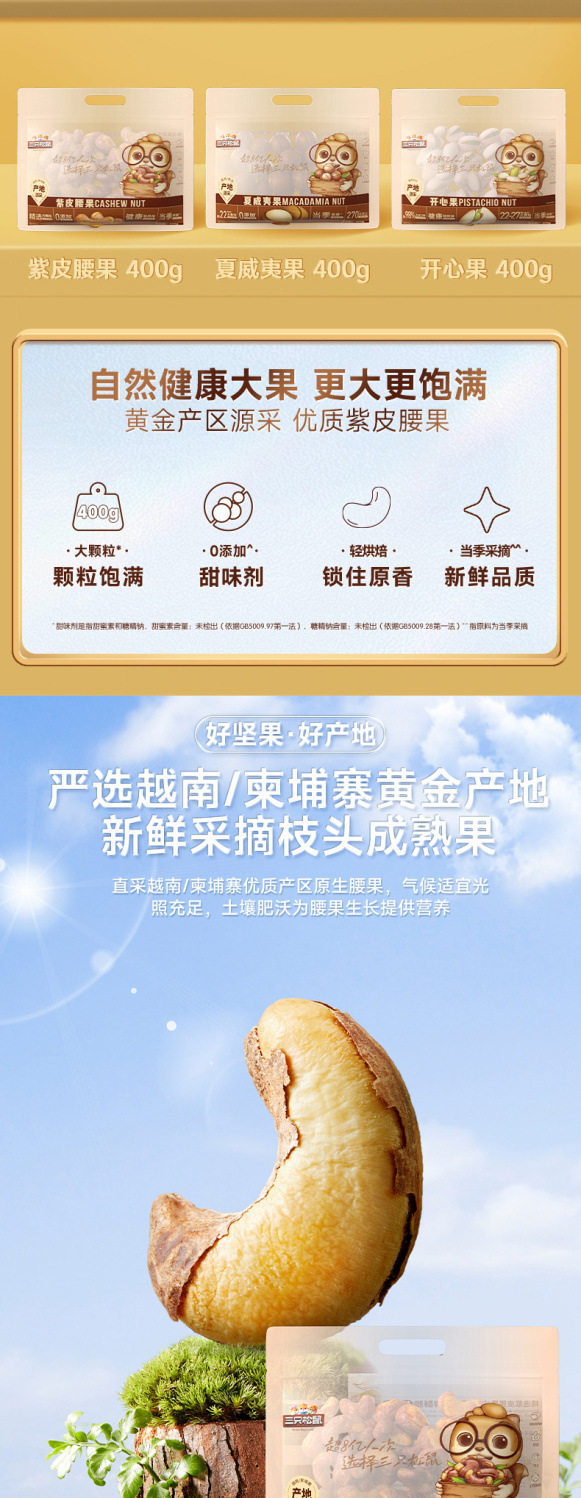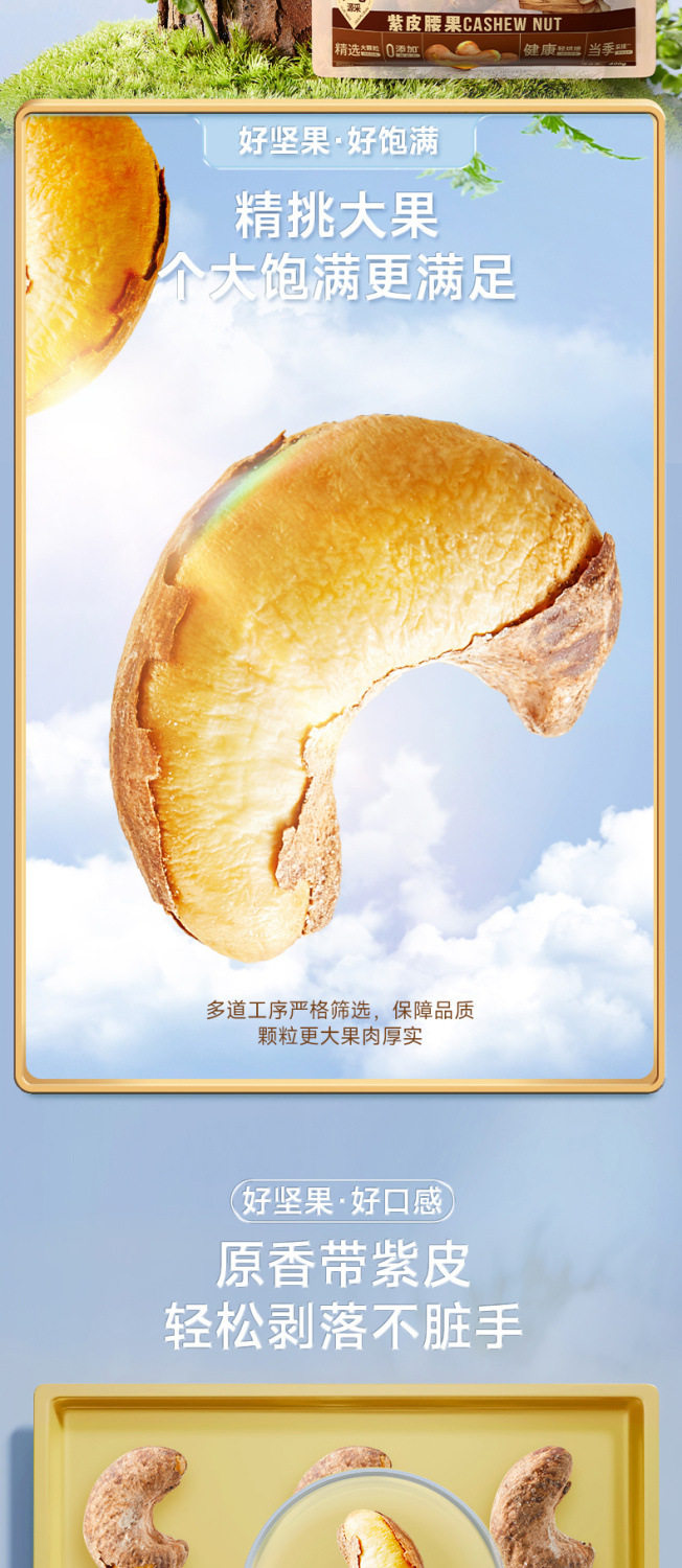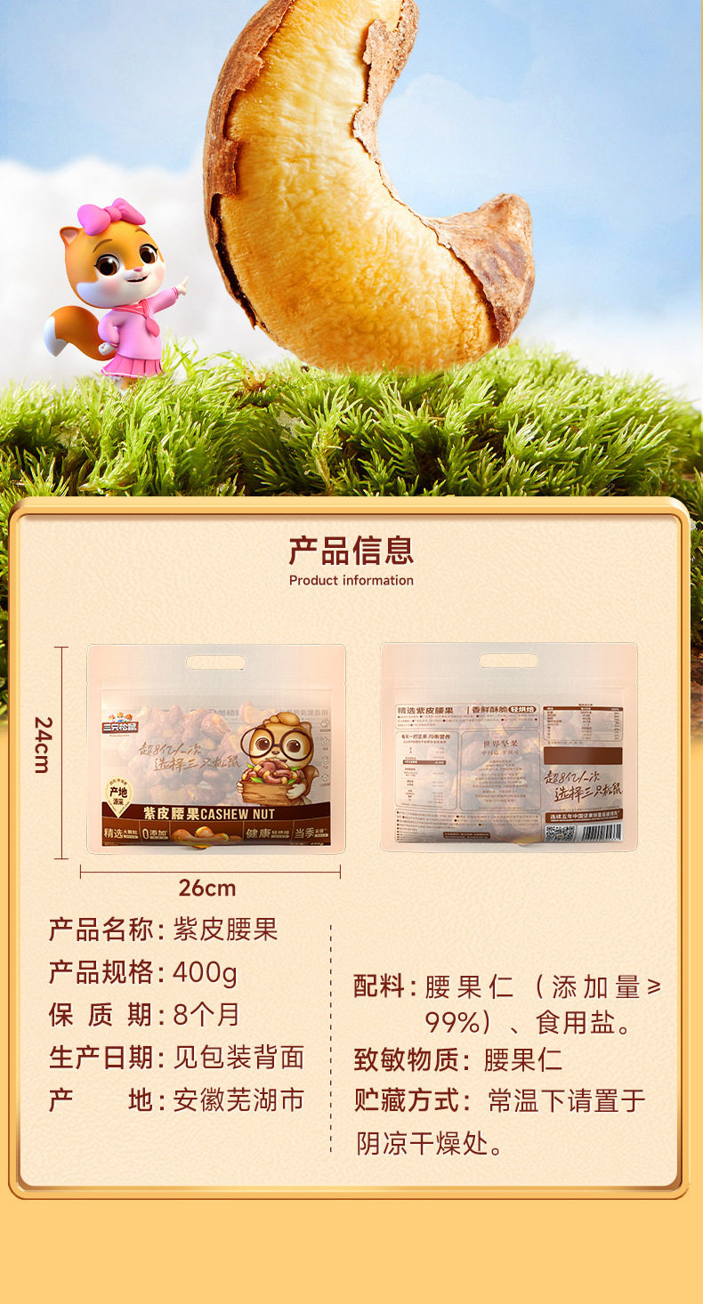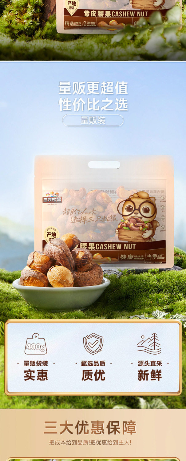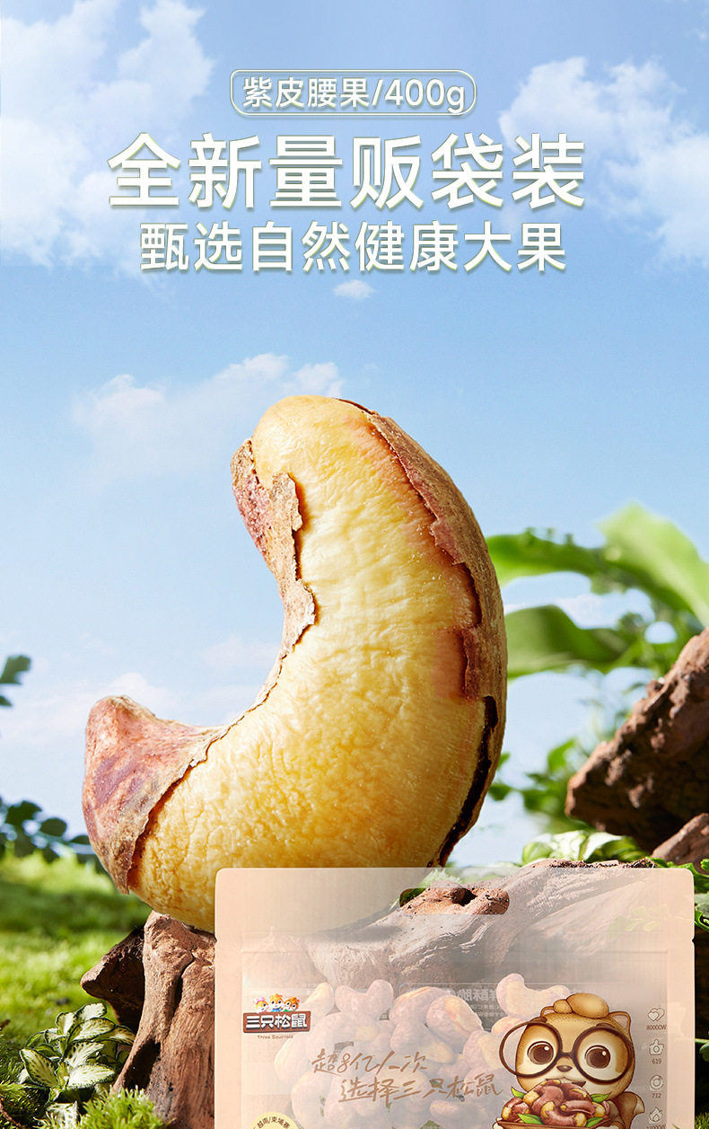 Three squirrels sold 400g * 1 bag of purple cashew nuts with skin nuts snacks original nut snacks healthy