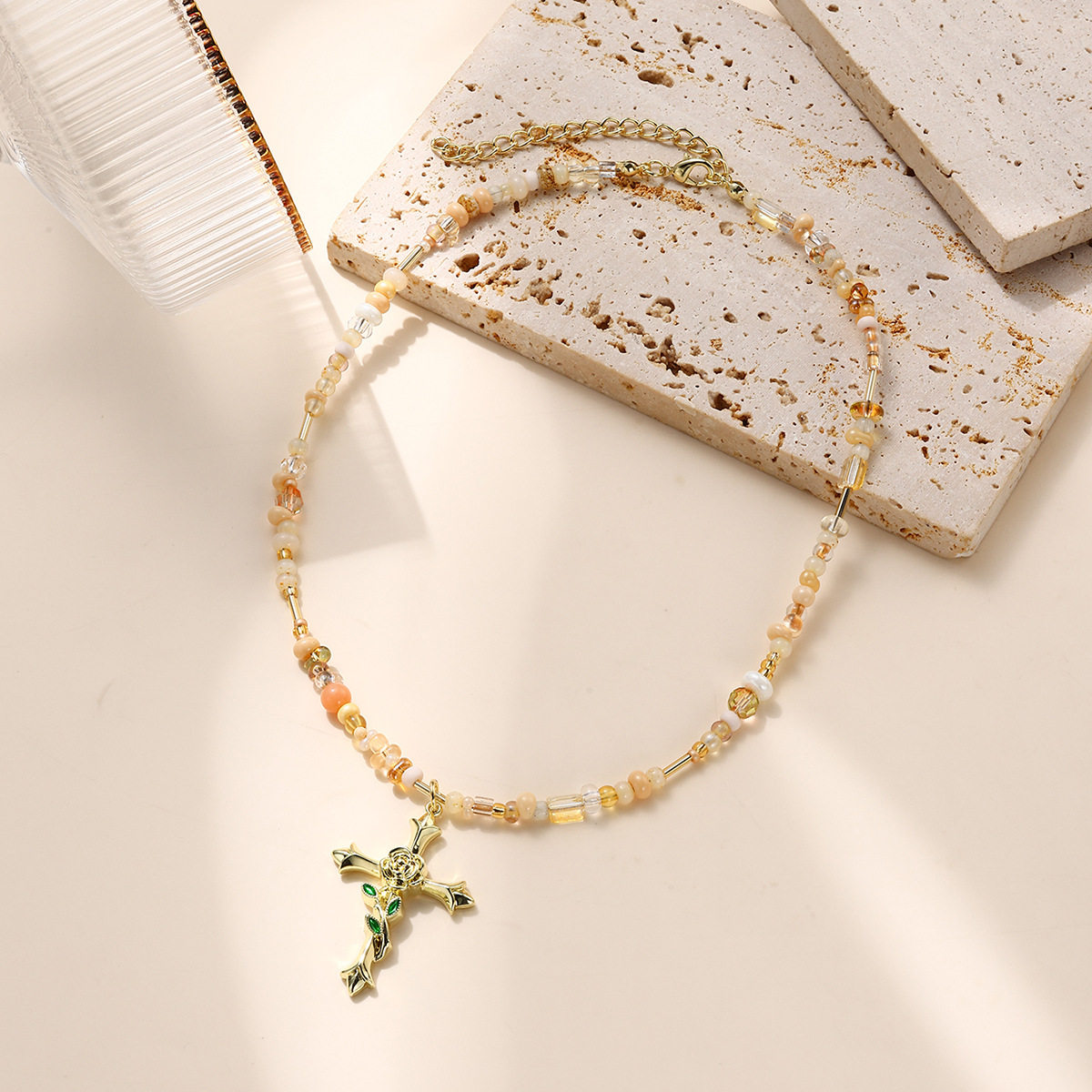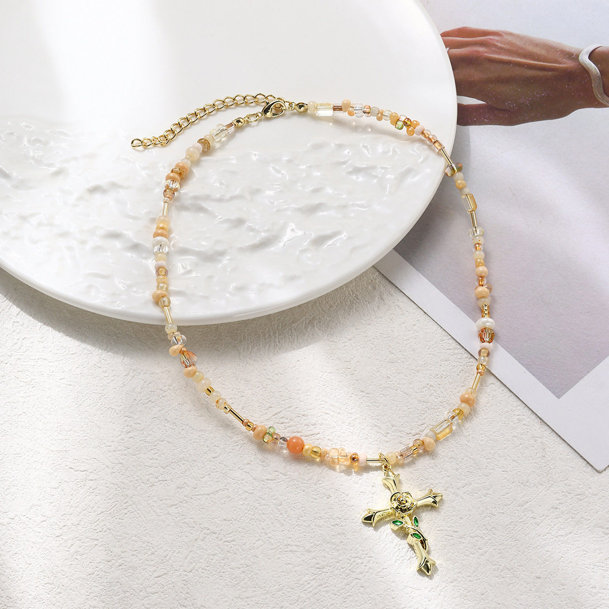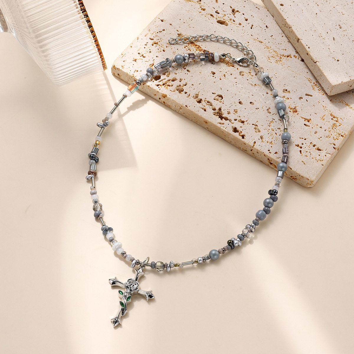 | Cross pendant necklace is not unique | European and american cross-border new splicing rose cross pendant necklace personalized irregular crystal beaded clavicle chain |