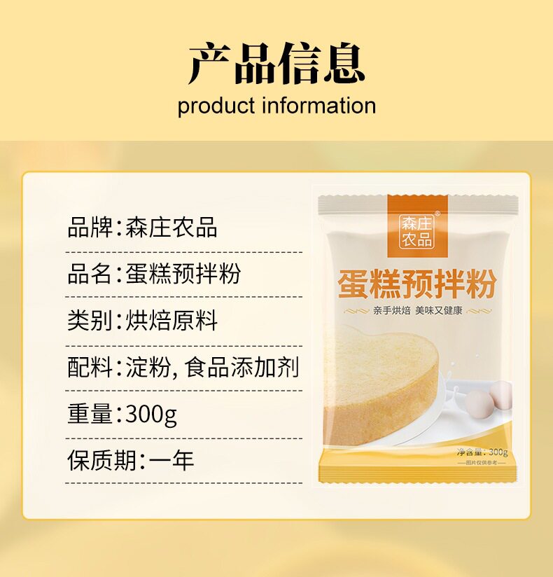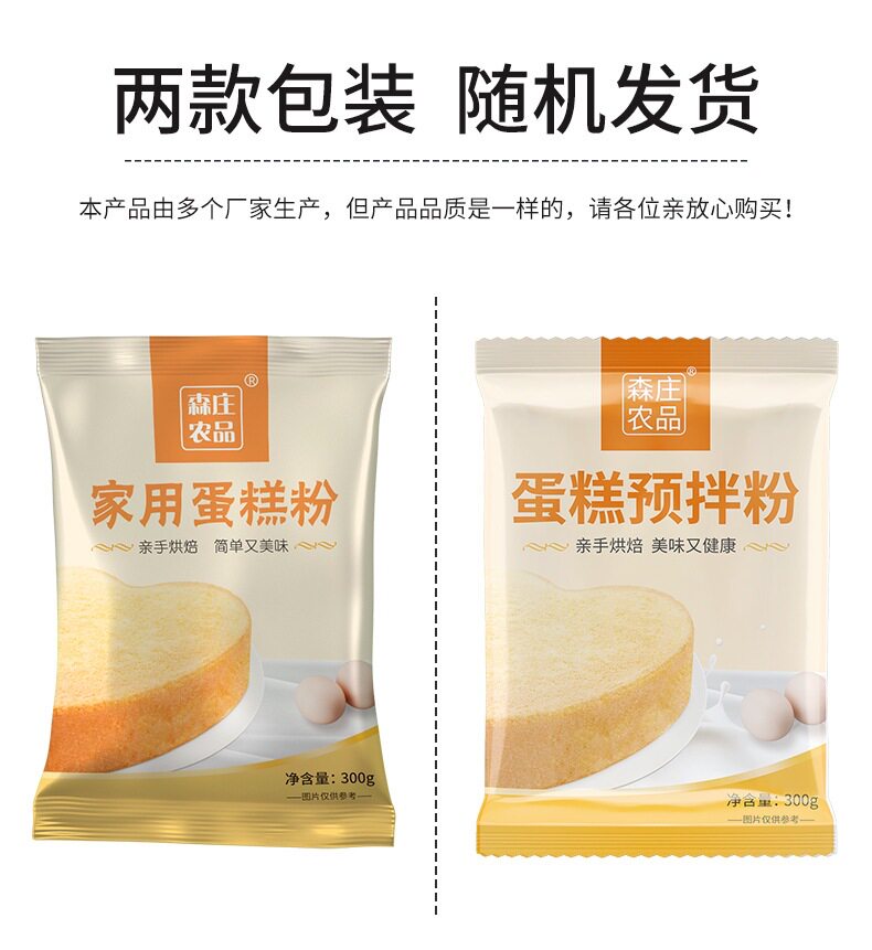 | Packaging specifications | Cake mix 300g*1 bag,Cake mix 300g*2 bags,Cake mix 300g*3 bags,Cake mix 300g*5 bags,Cake mix 300g*1 bag + 25 paper cups,(beginner’s package) cake mix 300g*2 bags + egg beater + measuring cup + oil brush,(children's set) cake mix 300g*3 bags + egg beater + measuring cup + oil brush + 25 paper cups,(family set) cake mix 300g*5 bags + egg beater + measuring cup + oil brush + 25 paper cups |