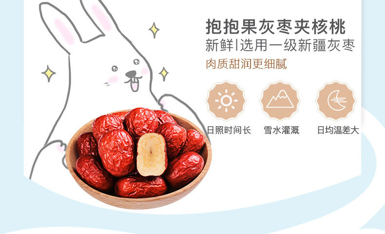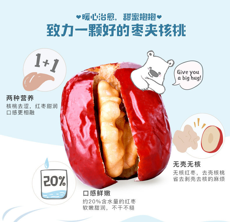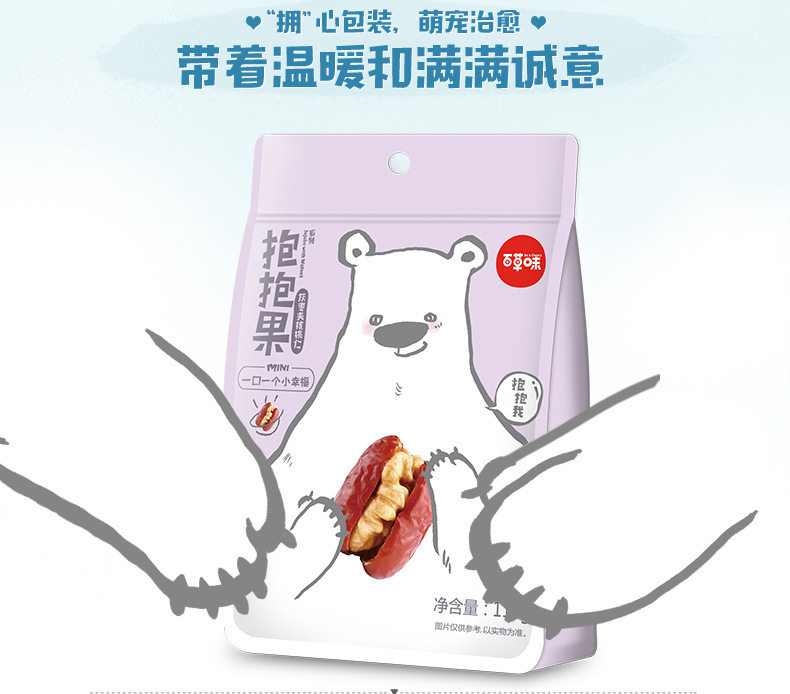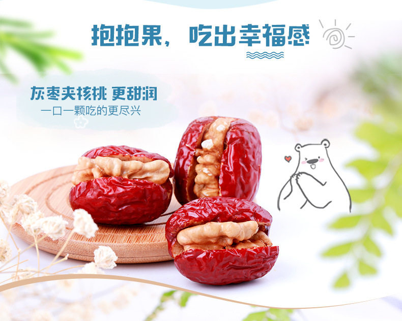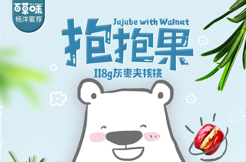 | Packaging specifications | Baicao flavor hug fruit gray dates with walnuts 118g |