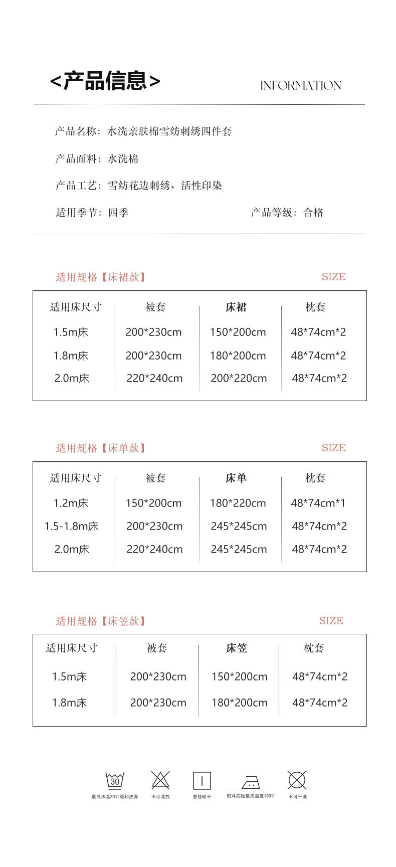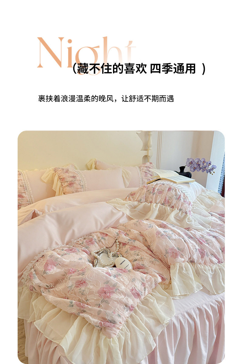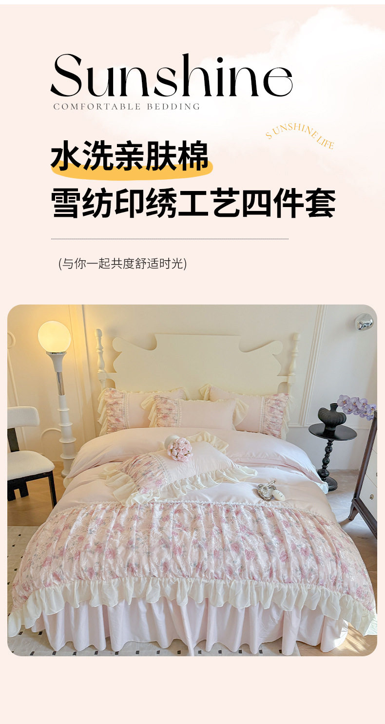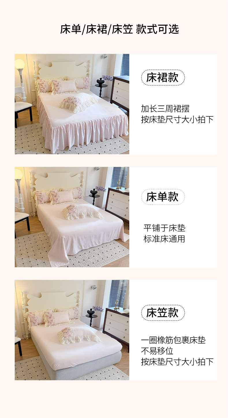 | Dimensions | 1.5m bed skirt four-piece set [quilt cover 200x230cm bed skirt 150x200cm pillowcase 48x74cm],1.8m bed skirt four-piece set [quilt cover 200x230cm bed skirt 180x200cm pillowcase 48x74cm],2.0m bed skirt four-piece set [quilt cover 220x240cm bed skirt 200x220cm pillowcase 48x74cm],Standard bed sheet four-piece set [quilt cover 200x230cm bed sheet 245x245cm pillowcase 48x74cm],Four-piece set of oversized bed sheets [quilt cover 220x240cm, bed sheets 245x245cm, pillowcase 48x74cm],1.5m fitted sheet set of four [quilt cover 200x230cm, fitted sheet 150x200cm, pillowcase 48x74cm],1.8m fitted sheet set of four [quilt cover 200x230cm, fitted sheet 180x200cm, pillowcase 48x74cm],1.2m bed sheet three-piece set [quilt cover 150x200cm bed sheet 180x220cm pillowcase 48x74cm] |