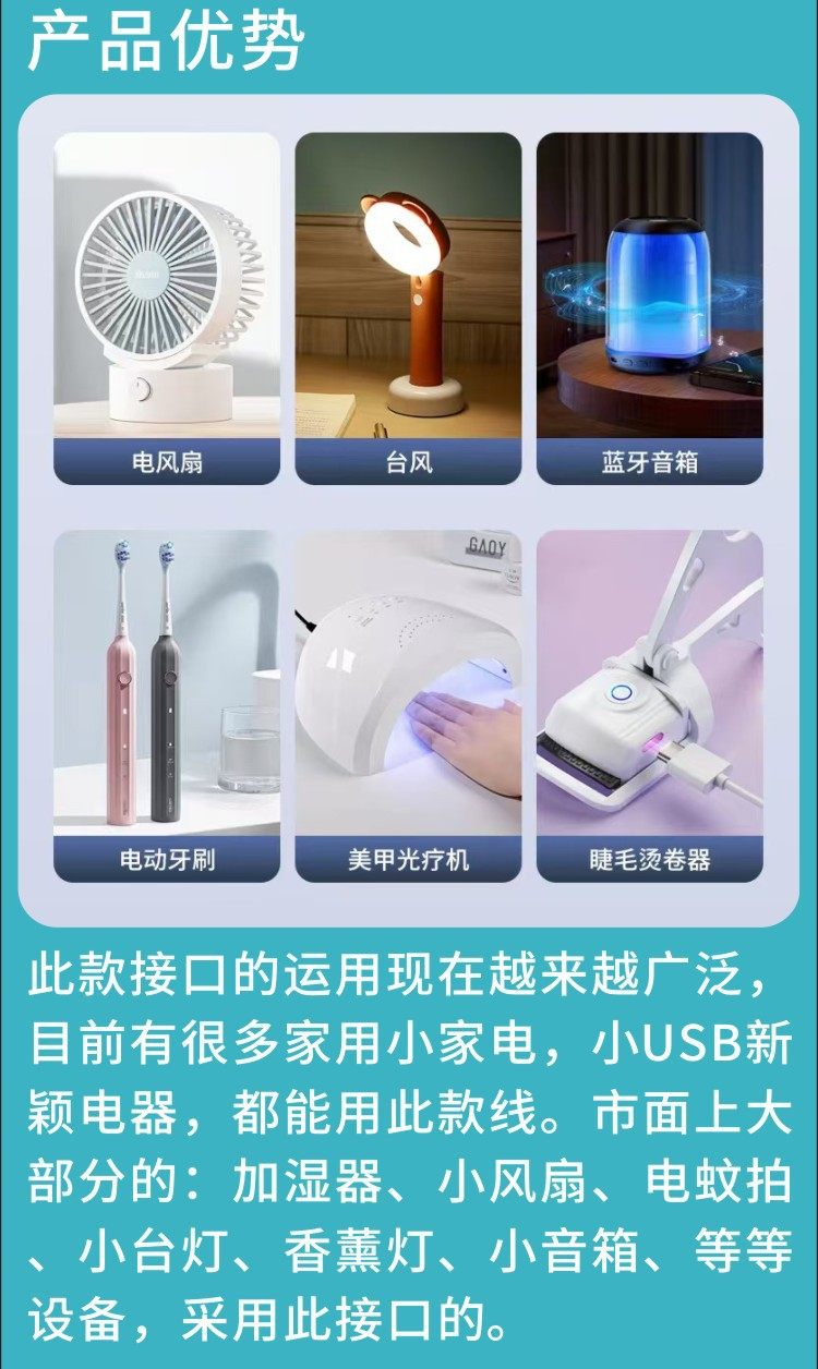 | Applicable products | Most of the devices on the market: humidifiers, small fans, electric mosquito swatters, small desk lamps, aromatherapy lamps, small speakers, etc. can generally be used with this interface |