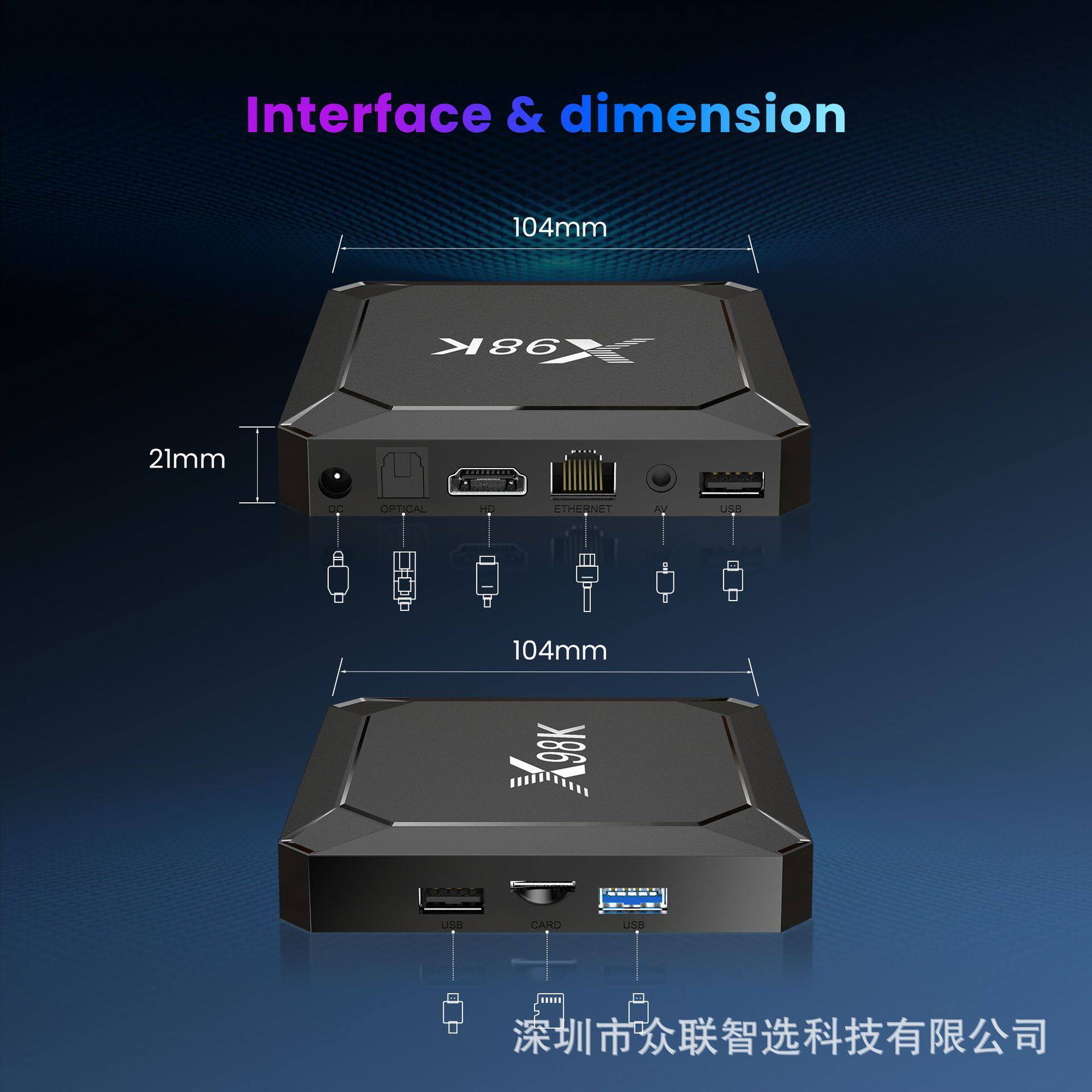 | Interface type | USB,WIFI,HDMI,AV,Fiber optic,Network interface |