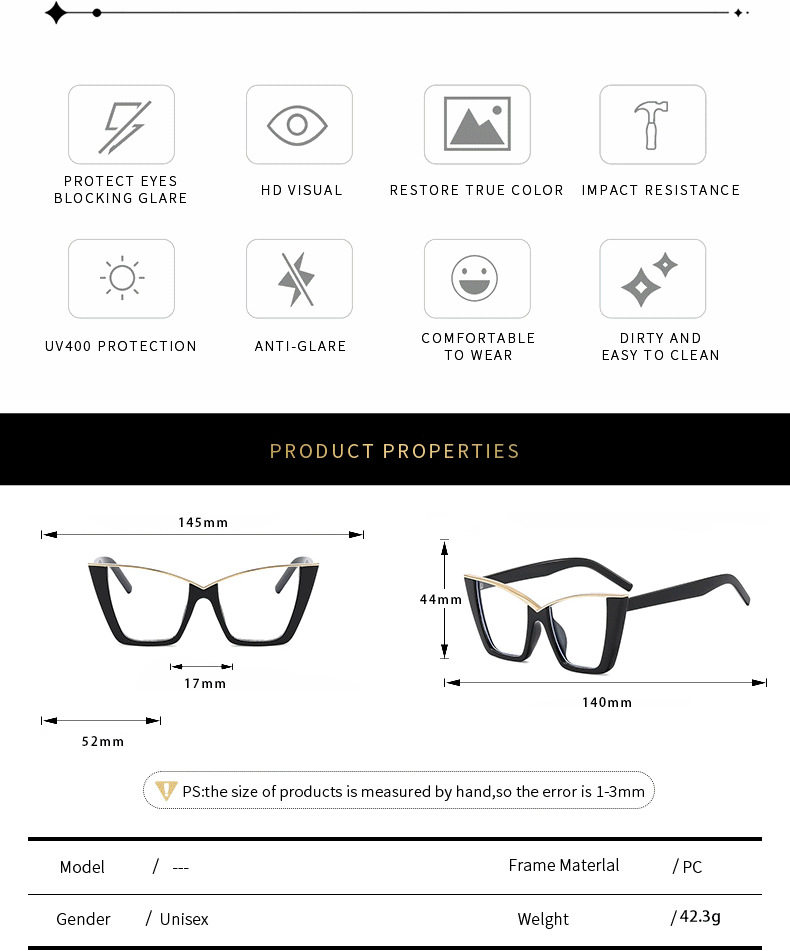 | Glasses style | Butterfly frame |