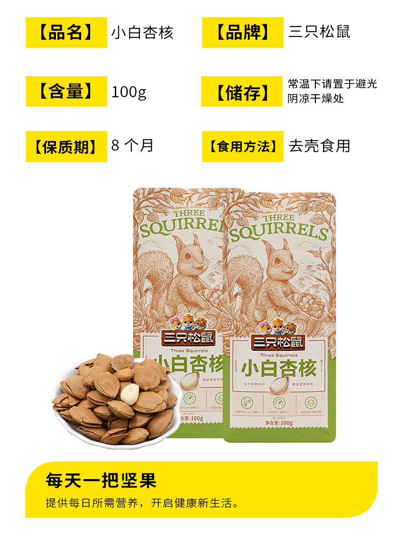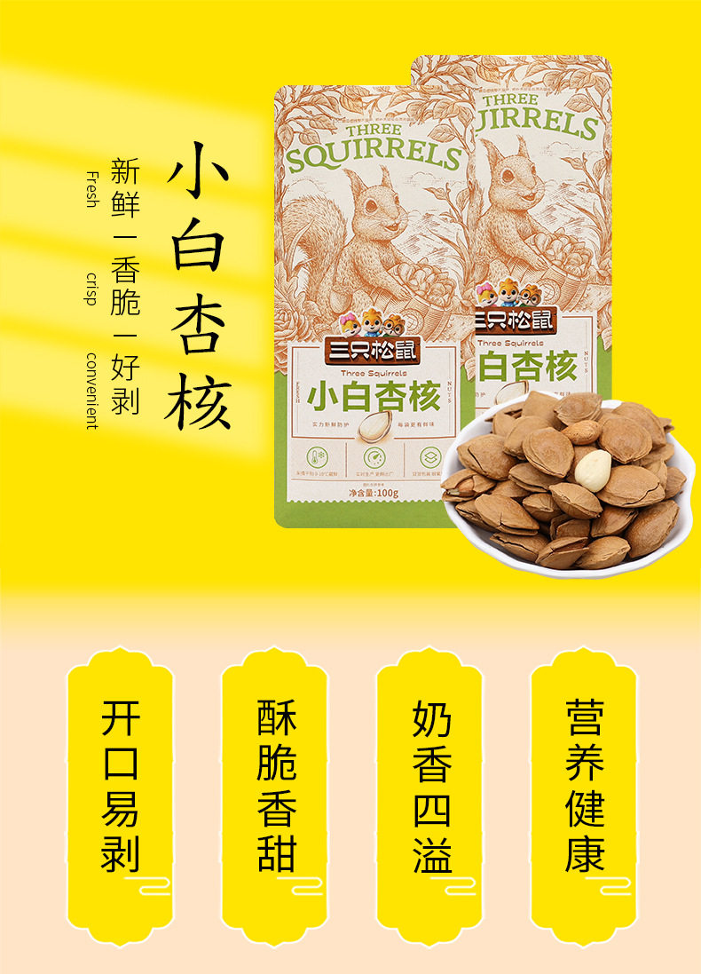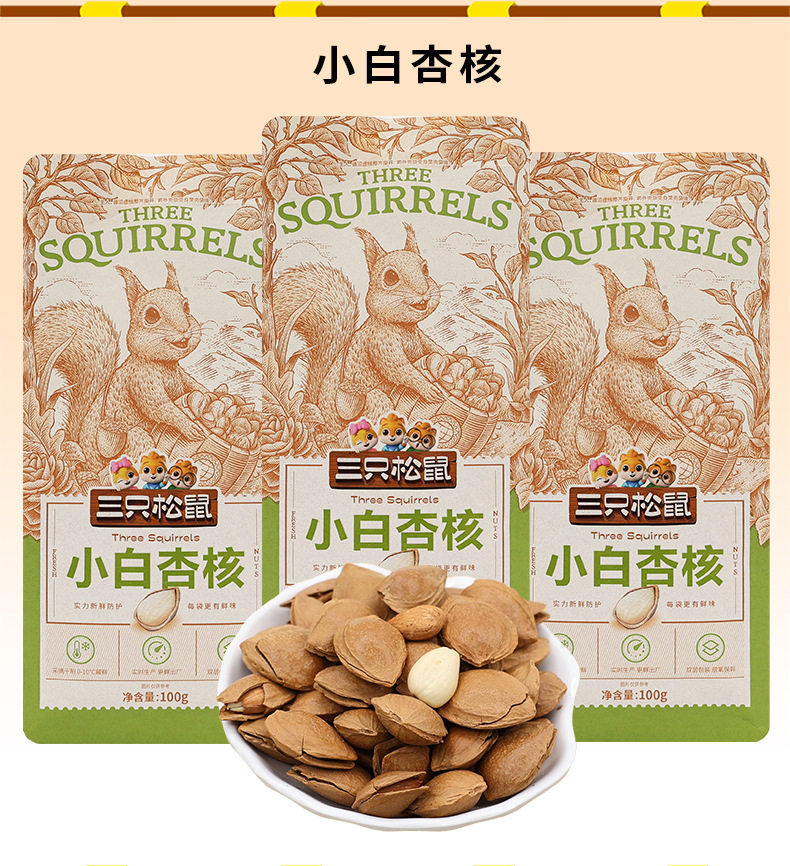 | Packaging specifications | Three squirrels little white apricot 100gx1 bag,Three squirrels little white apricot 100gx2 bags,Three squirrels little white apricot 100gx3 bags,Three squirrels little white apricot 100gx5 bags,Three squirrels little white apricot 100gx10 bags |