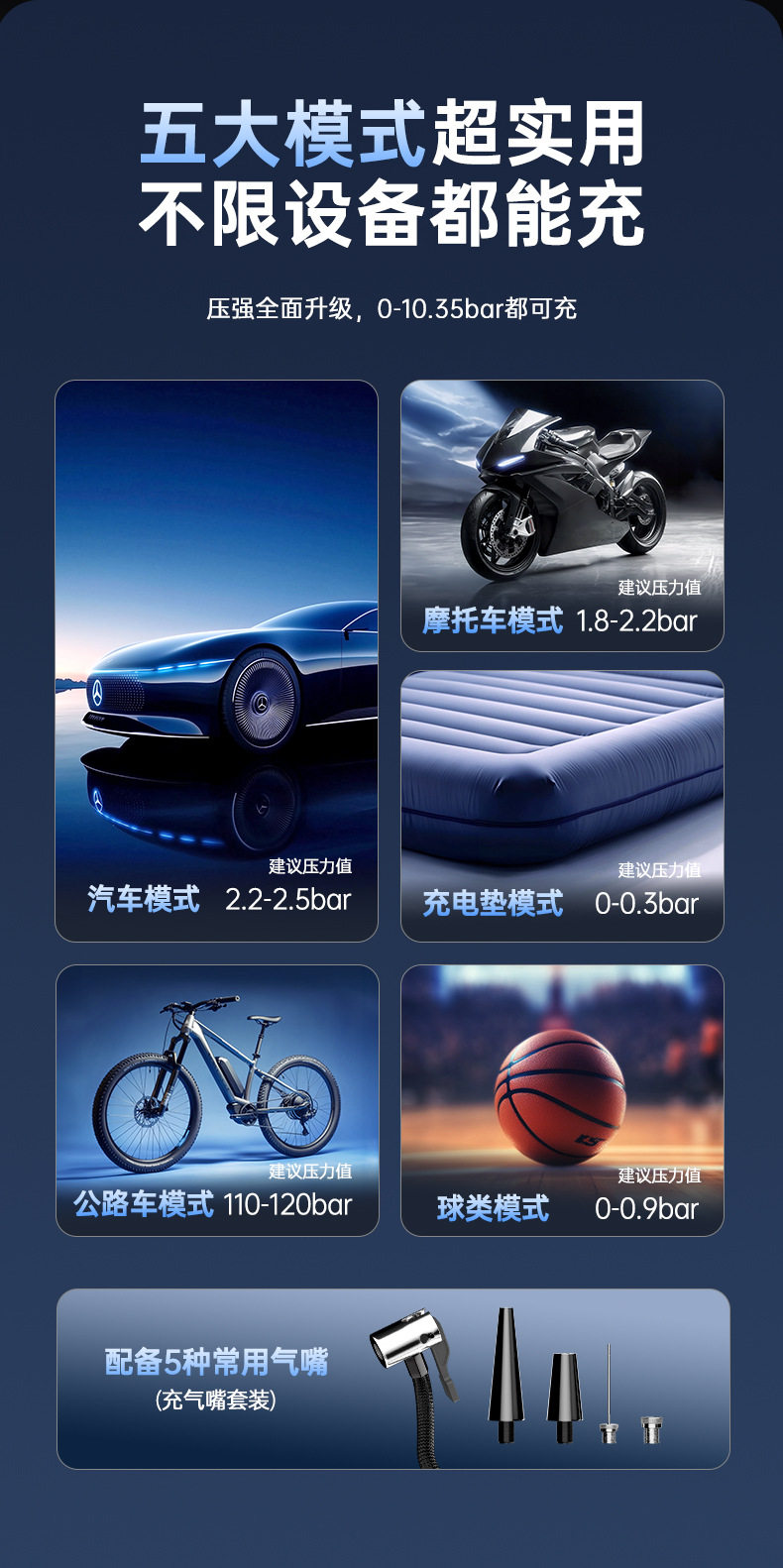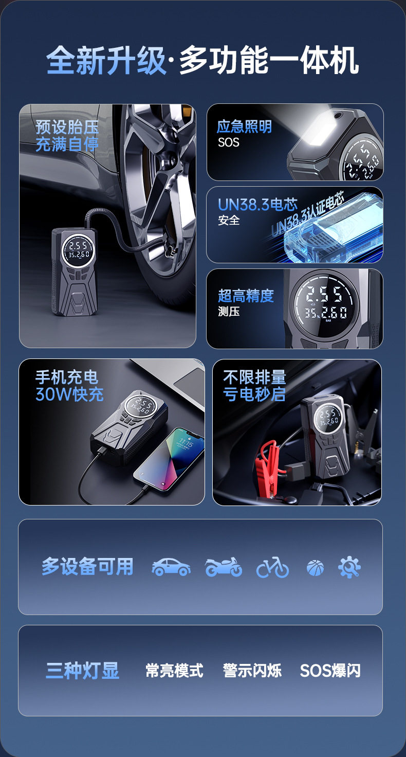 | Additional features | Lighting,Tire pressure gauge,Warning light,Vacuum,Usb charging |