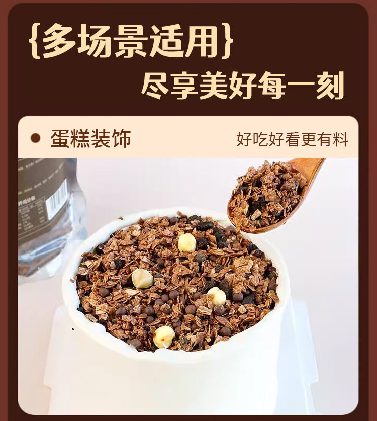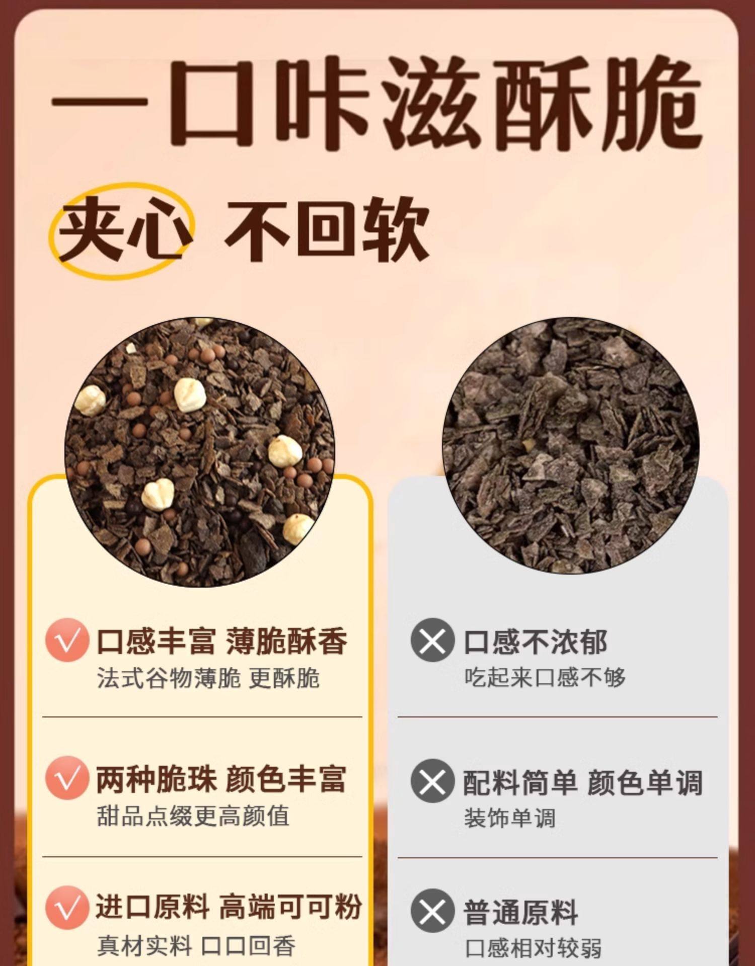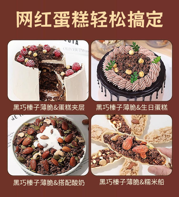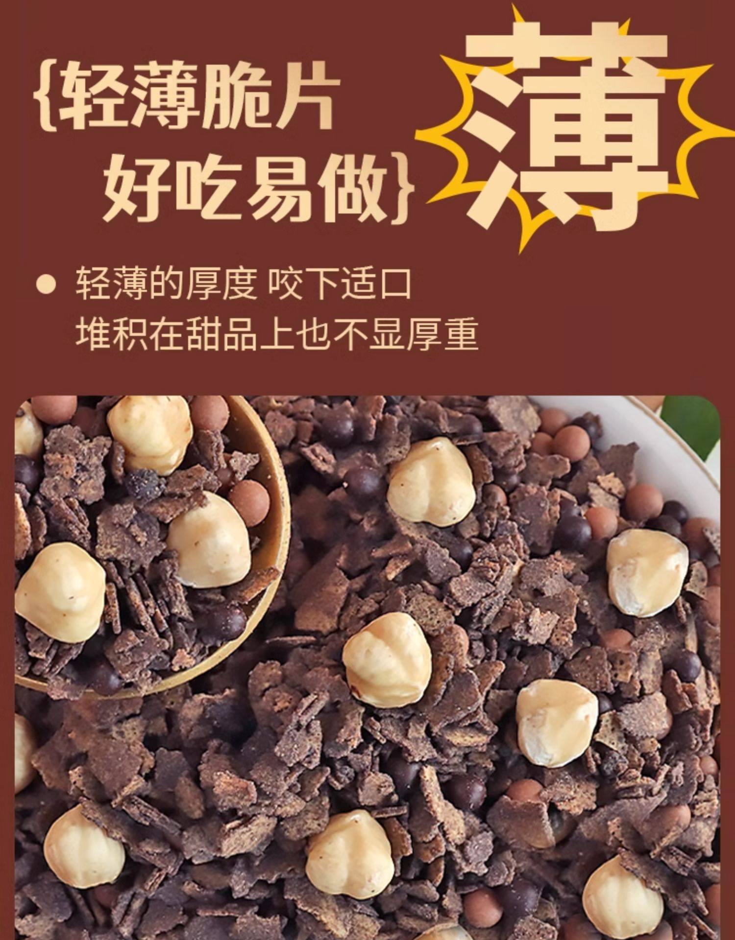 | Packaging specifications | Chocolate crisp beads 250g,Chocolate crisp beads 250g*5 packs,Chocolate crunchy beads 250g [pure cocoa butter],Large caramel color crispy beads 250g,Sandwiched chocolate crisp 500g [3-layered taste, good quality],Sandwich chocolate crisp 500g*5 packs [commercial stocking],Chocolate coated crispy 500g [pure cocoa butter],Chocolate coated crisps 500g [buy one get one free],Chocolate coated crisps total 5kg [buy 5 get 5 free, get the same style],Pengye milk-flavored crispy coating 500g [quality upgrade, delicious and not soft],Sandwich crispy 500g + crispy beads 250g,Pure fat sandwich 2-piece set, total 750g,Sandwich chocolate crisp 500g*2 pack [special offer],Aochao filling + black hazelnut total 1000g,Chocolate coated waffle crisps 5 pack mix,Dark hazelnut chocolate crisp 500g [no additional price for additional ingredients],Hazelnut crispy crumbs 500g [pure fat, high quality],Pistachio chocolate crisp 500g,[new style] baiqiao mixed nut crisps-500g,Black hazelnut crisp + white hazelnut crisp total 1000g,Hazelnut chocolate coated crispy 500g [super hazelnut quality upgrade],Hyouya butter crispy 500g [high quality special offer],Cocoa flavored crisps 500g,Chocolate flavored waffle crisp 250g,Yogurt flavored waffle crisps 250g,Strawberry flavored waffle crisp 250g,Matcha flavored waffle crisp 250g,Lemon flavored waffle crisp 250g,[crispy texture] yogurt flavored chocolate waffle crisps 1kg,[dark butter flavor] crispy 500g,200g chopped hazelnuts,100g crushed pistachios,500g crushed peanuts,Baked sliced almonds 100g,Peanut slices 100g,Dried flame raisins 100g,Dried cranberries 100g,Small chocolate crisp beads 500g,Ponya chocolate crisp sauce 1kg [special price],Chocolate flavored noodle sauce 1kg [silky texture, non-drying noodles],Chocolate peanut crispy sauce 1kg [hot sale],Chocolate crispy crumbly sauce 1kg [hot sale],【commercial 1.0kg】chocolate hazelnut crispy spread 1kg,Pistachio chocolate crisp filling 1kg [hot sale],Menglong crispy 500g,Chocolate oatmeal crisps 4 get 1 free, 5 packs shipped,【cocoa】thinly chopped 500g (easy to store),Strawberry flavored butter crisp 500g,Coconut flavored butter crisp 500g,Ponya butter flavored butter crispy 200g [trial pack],Guoranjun blueberry apple filling 3kg [high cost performance],Huayu blueberry puree 1kg [can be covered or sandwiched],Huayu mango puree 1kg [can be covered or sandwiched],Huayu strawberry puree 1kg [can be covered or sandwiched],Huayu meilong melon and fruit puree 1kg [can be covered with noodles or filled with anything],[crispy taste] hazelnut flavored chocolate waffle crisp 1kg |