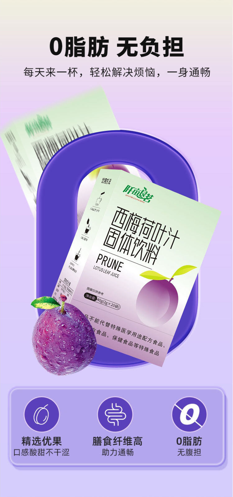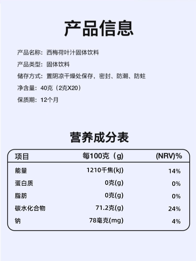 | Packaging specifications | Prune lotus leaf juice solid drink 40g/box (2gx20 bags) |