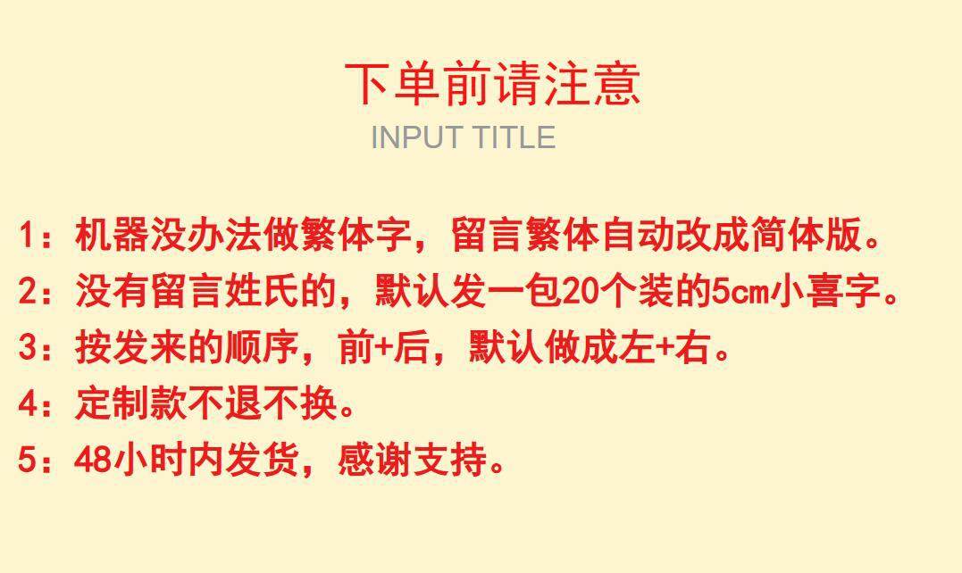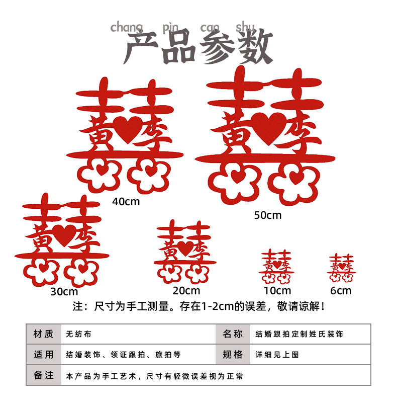 | Specification | Surnames xi—2 small flower xis (customized models are not returnable) remarks on surname,Happy surname - 2 happy hearts (customized models are not returnable) remarks on surname,2 surnames xi-cao xi (customized models are not returnable) remarks on surname,Happy surname - 2 zhengxi (customized models are not returnable) remarks on surname,Surnames xi—2 yuanxi (customized models are not returnable) remarks on surname,Happy surname - 1 small flower (customized models are not returnable) remarks on surname,Happy surname - 1 happy heart (customized models are not returnable) remarks on surname,First name xi—1 cao xi (customized models are not returnable) remarks on surname,Happy surname - 1 zhengxi (customized models are not returnable) remarks on surname,Happy surname - 1 yuanxi (customized models are not returnable) remarks on surname,Family name is happy - 2 cao xi (without love) |