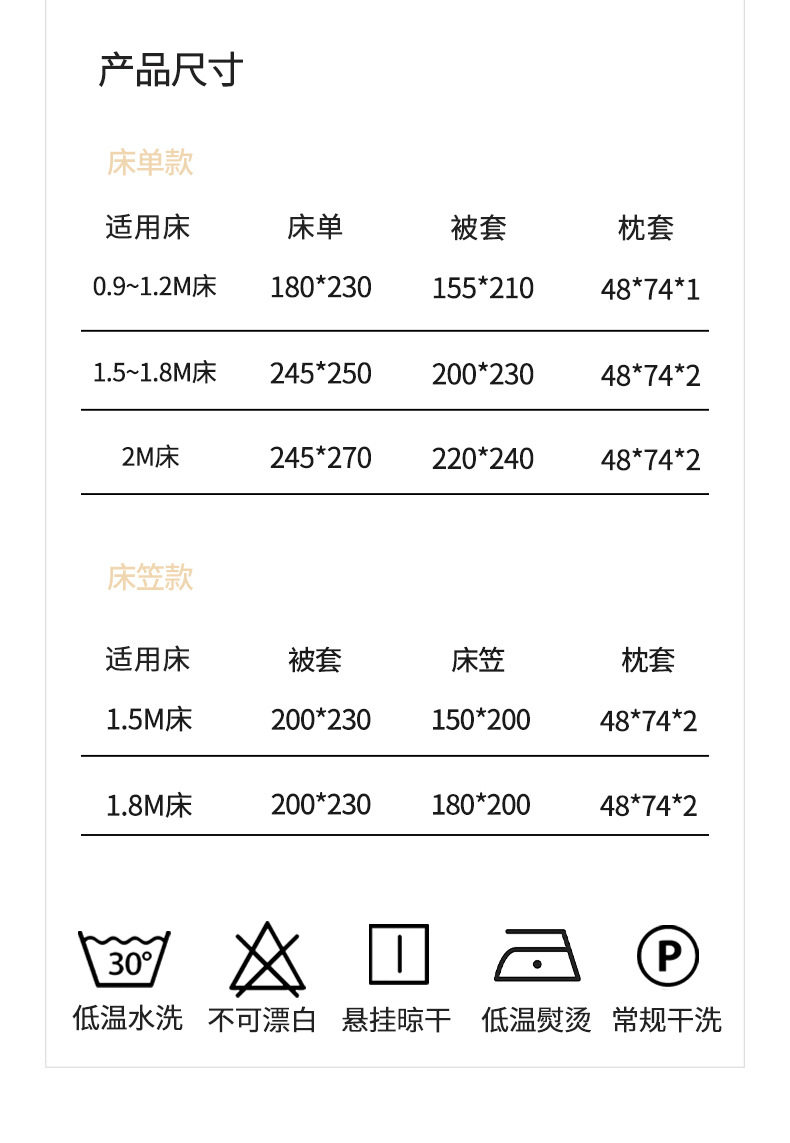 | Dimensions | Suitable for 0.9- 1.2m bed three-piece bed sheet set, recommended matching [150*200cm quilt core],Suitable for 1.5m bed four-piece bed sheet set, recommended matching [200*230cm quilt core],Suitable for 1.8m bed four-piece bed sheet set, recommended matching [200*230cm quilt core],Suitable for 2.0m bed bed sheets, four-piece set, recommended matching [220*240cm quilt core],Suitable for 1.5m bed fitted sheet set, recommended to match [200*230cm quilt core],Suitable for 1.8m bed fitted sheet set, recommended to match [200*230cm quilt core] |