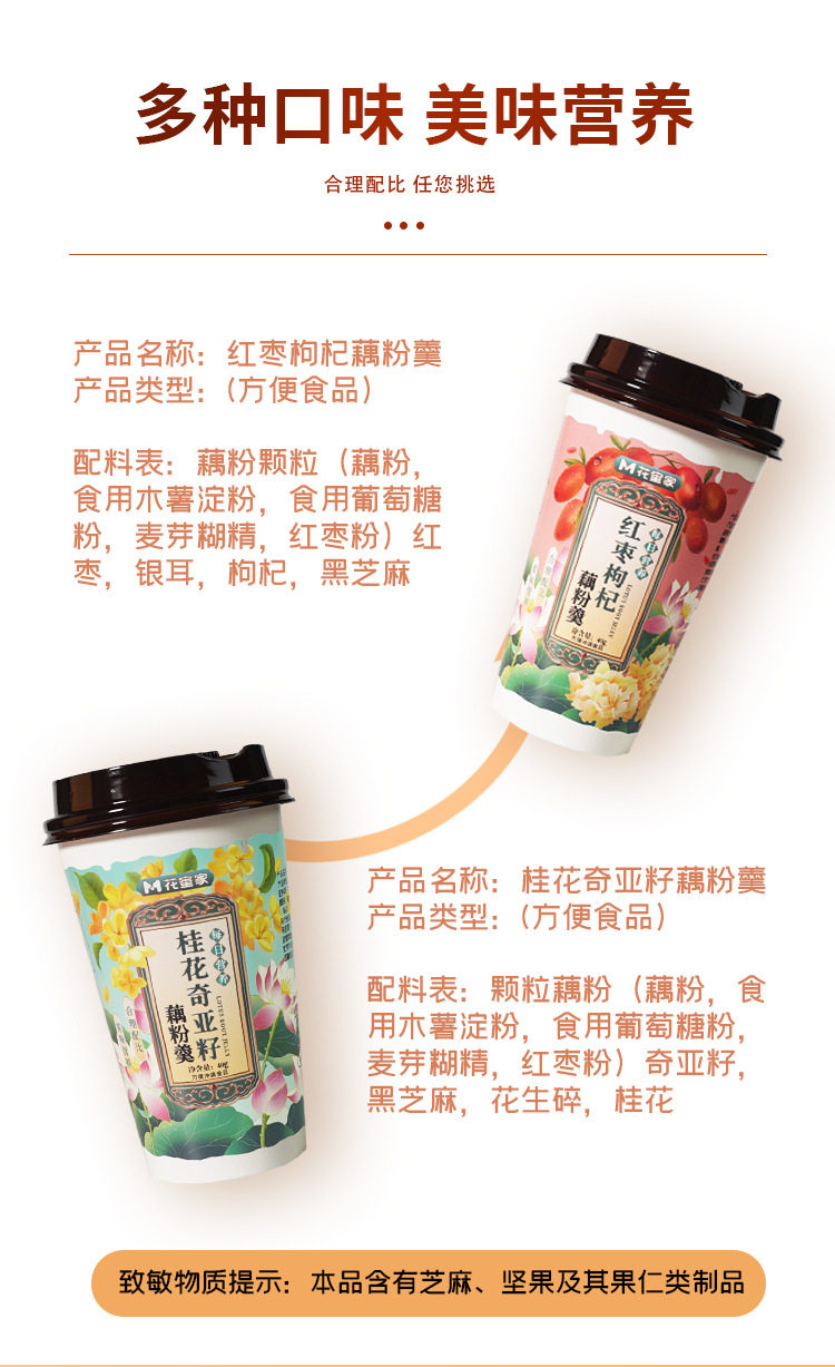 | Packaging specifications | 6 cups of osmanthus chia seed lotus root powder,6 cups of red dates, wolfberry and lotus root powder,6 cups of mixed flavor lotus root starch,Osmanthus, chia seed and lotus root powder 12 cups,12 cups of red dates, wolfberry and lotus root powder,12 cups of mixed flavor lotus root starch,Lotus root starch gift box 18 cups,3 cups of osmanthus chia seed lotus root powder,3 cups of red dates, wolfberry and lotus root powder,3 cups of mixed flavor lotus root starch,8 cups of osmanthus chia seed lotus root powder,8 cups of red dates, wolfberry and lotus root powder,8 cups of mixed flavor lotus root starch |