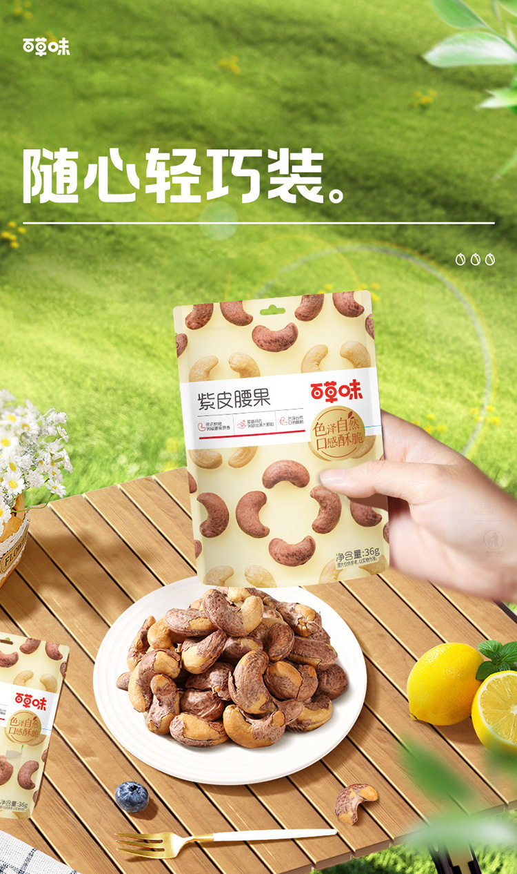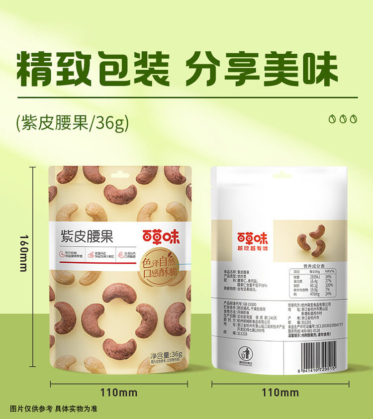 | Packaging specifications | Baicao flavor purple cashew nuts 36g |