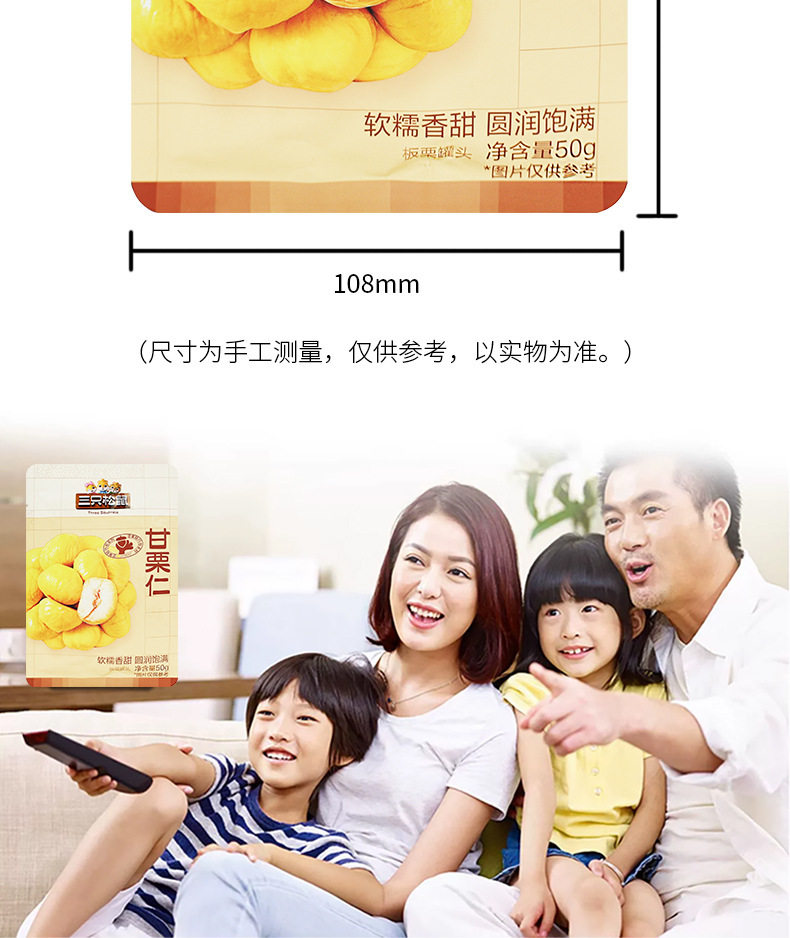 | Packaging specifications | Three squirrels sweet chestnut kernel 50gx1 bag,Three squirrels sweet chestnut kernel 50gx2 bags,Three squirrels sweet chestnut kernel 50gx3 bags,Three squirrels sweet chestnut kernel 50gx5 bags,Three squirrels sweet chestnut kernel 50gx10 bags |