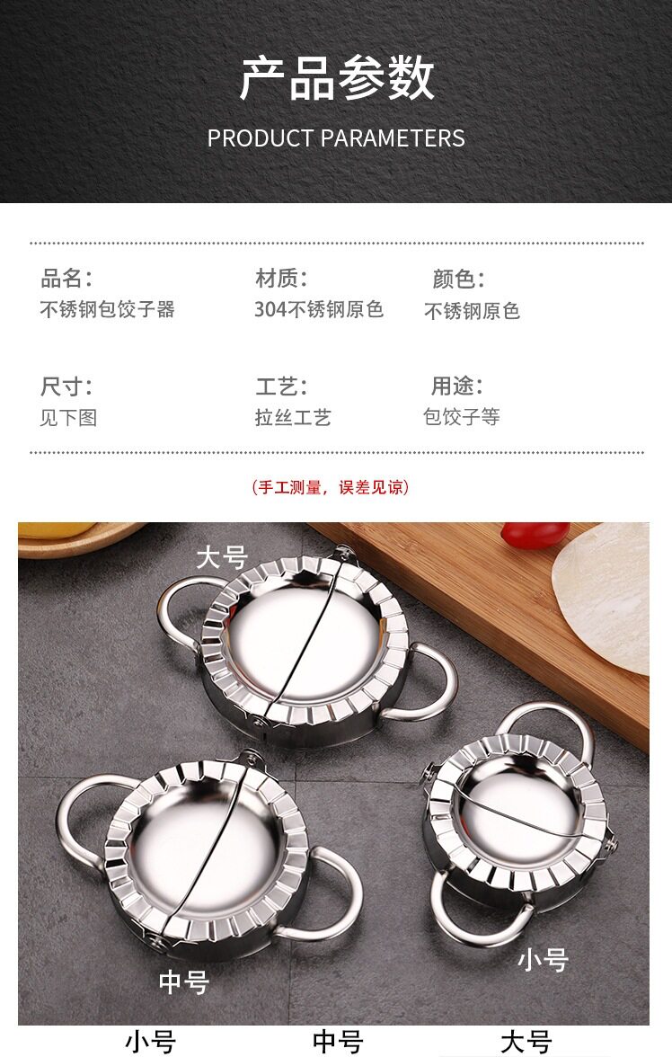 | Specification | .❋☽☽Large leather printer❋☽☽,.❋☽☽430 small dumpling mold 7.5cm❋☽☽,.❋☽☽430 medium dumpling mold 8.5cm❋☽☽,.❋☽☽430 large dumpling mold 9.5cm❋☽☽,.❋☽☽304 small dumpling mold 7.5cm❋☽☽,.❋☽☽304 medium dumpling mold 8.5cm❋☽☽,.❋☽☽304 large dumpling mold 9.5cm❋☽☽,.❋☽☽Medium leather printer❋☽☽,.❋☽☽Small leather printer❋☽☽,.❋☽☽304 stainless steel filling pick❋☽☽,.❋☽☽Large dumpling mold + large round cutter + 304 filling pick❋☽☽,.❋☽☽Medium dumpling mold + medium round cutter + 304 filling pick❋☽☽,. ❋ ☽ ☽ Small dumpling mold + small round cutter + 304 filling pick ❋ ☽ ☽,.❋☽☽Large skin pusher❋☽☽,.❋☽☽Medium skin pusher❋☽☽,.❋☽☽Small skin pusher❋☽☽,❋☽☽430 small dumpling mold 7.5cm❋☽☽,❋☽☽430 medium dumpling mold 8.5cm❋☽☽,❋☽☽430 large dumpling mold 9.5cm❋☽☽,❋☽☽304 small dumpling mold 7.5cm❋☽☽,❋☽☽304 medium dumpling mold 8.5cm❋☽☽,❋☽☽304 large dumpling mold 9.5cm❋☽☽,❋☽☽Large leather printer❋☽☽,❋☽☽Medium leather printer❋☽☽,❋☽☽Small leather printer❋☽☽,❋☽☽304 stainless steel filling pick❋☽☽,❋☽☽Large dumpling mold + large round cutter + 304 filling pick❋☽☽,❋☽☽Medium dumpling mold + medium round cutter + 304 filling pick❋☽☽,❋☽☽Small dumpling mold + small round cutter + 304 filling pick❋☽☽,❋☽☽Large skin pusher❋☽☽,❋☽☽Medium skin pusher❋☽☽,❋☽☽Small skin pusher❋☽☽ |