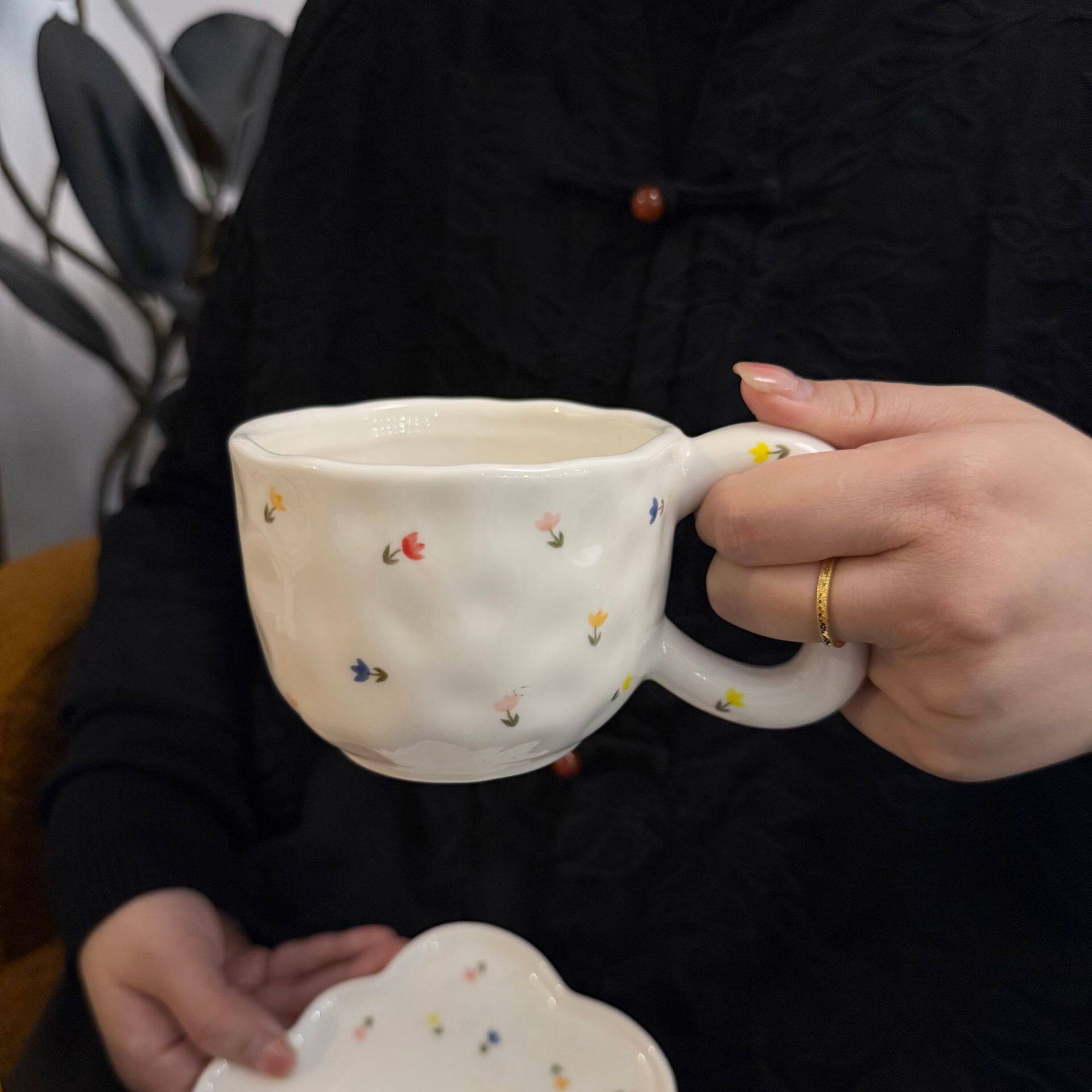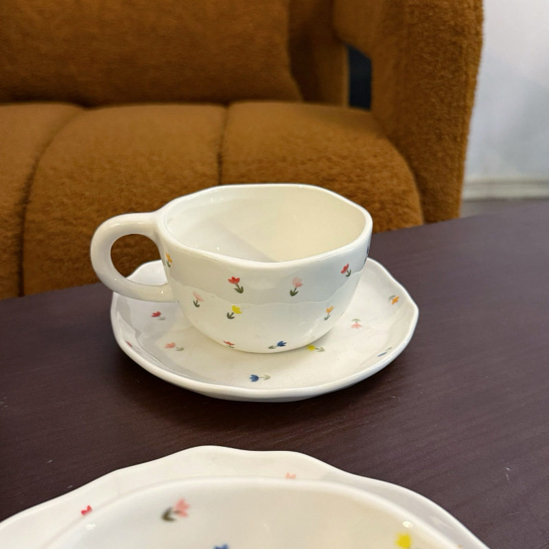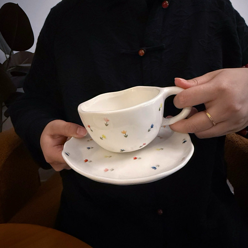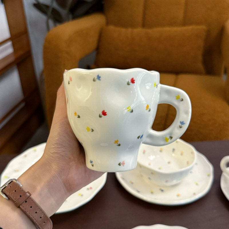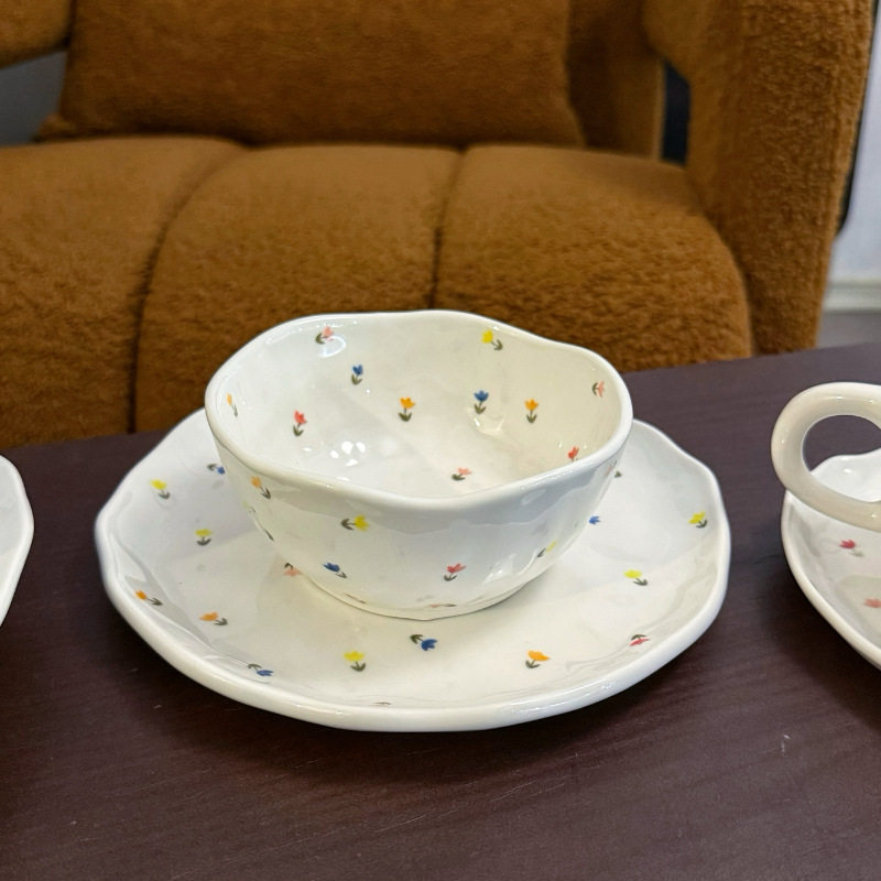 Korean Style Ins Style Hand-painted Color Tulip Ceramic Plate Hand-kneading Bowl High Color Value Coffee Cup and Saucer Oval Plate
