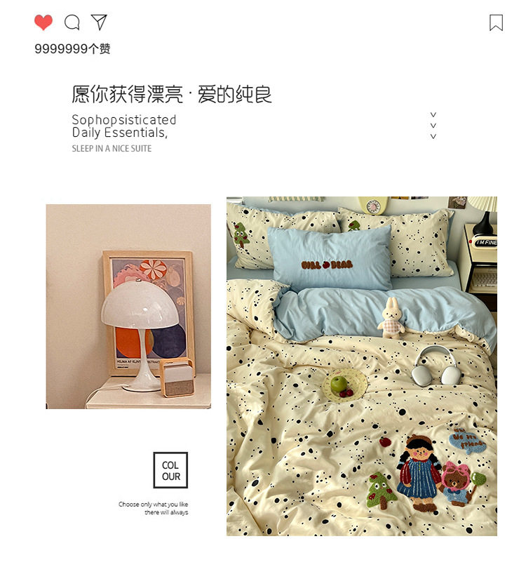 | Dimensions | 0.9m dormitory bed sheet [quilt cover 150*200cm] 3-piece set,1.2m bed sheet [quilt cover 150*200cm] 3-piece set,1.5m bed sheet [quilt cover 150*200cm] 4-piece set,1.5m bed sheet [quilt cover 180*220cm] 4-piece set,1.5m bed sheet [quilt cover 200*230cm] 4-piece set,1.8m bed sheet [quilt cover 200*230cm] 4-piece set,2.0m bed sheet [quilt cover 200*230cm] 4-piece set,1.5m fitted sheet [quilt cover 180*220cm] 4-piece set,1.8m fitted sheet [quilt cover 180*220cm] 4-piece set,1.5m fitted sheet [quilt cover 200*230cm] 4-piece set,1.8m fitted sheet [quilt cover 200*230cm] 4-piece set |