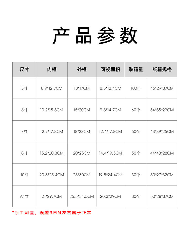 | Inner frame size | 5 inches 8.9*12.7cm,6 inches 10.2*15.3cm,7 inches 12.7*17.8cm,8 inches 15.2*20.3cm,10 inches 20.3*25.4cm,A4 inch 21*29.7cm |