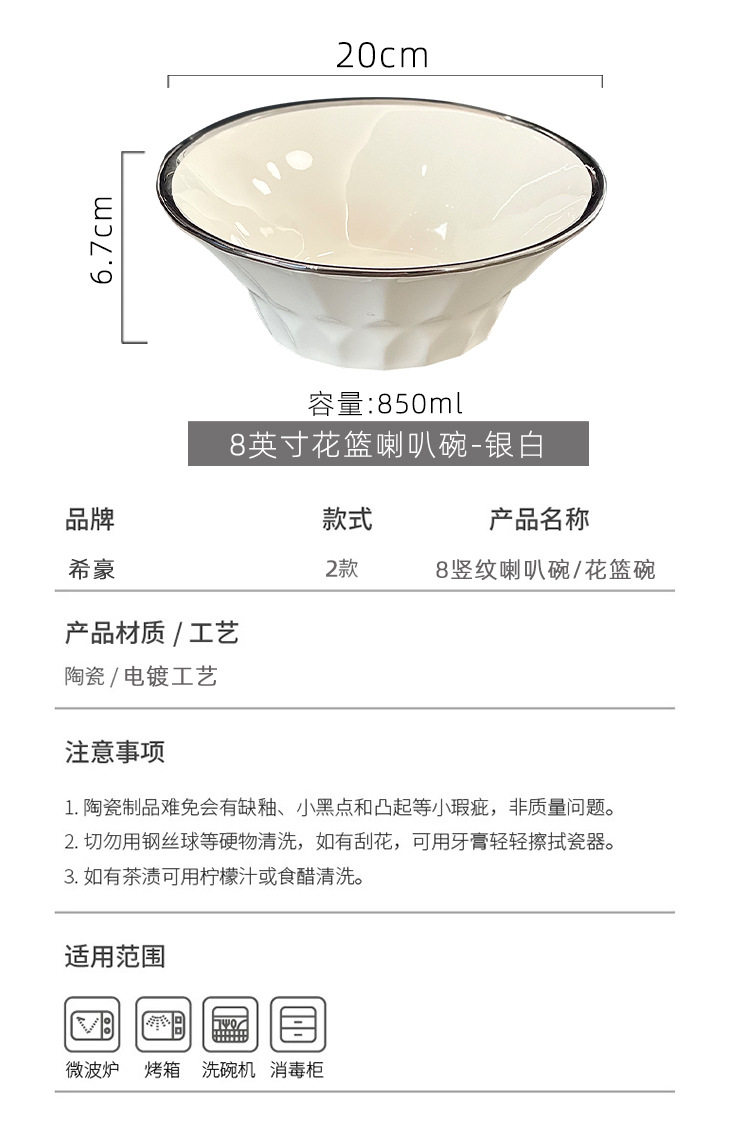 | Color | 8inch vertical pattern trumpet bowl-silver white,8inch flower basket trumpet bowl-silver white,8inch vertical pattern trumpet bowl (with chopsticks) - silver white,8inch flower basket trumpet bowl (with chopsticks) - silver |