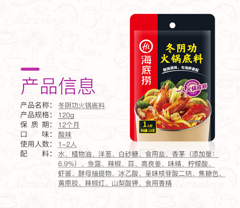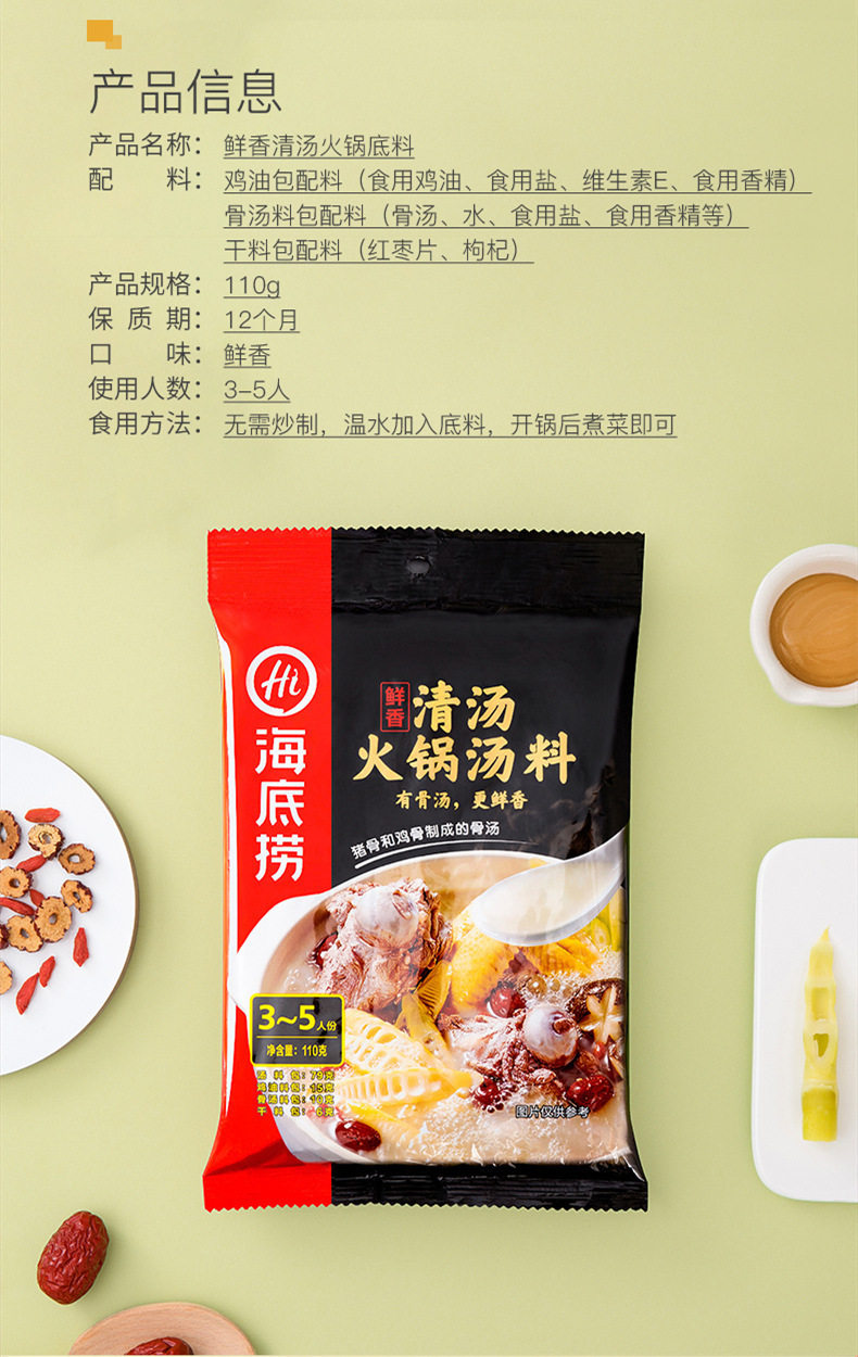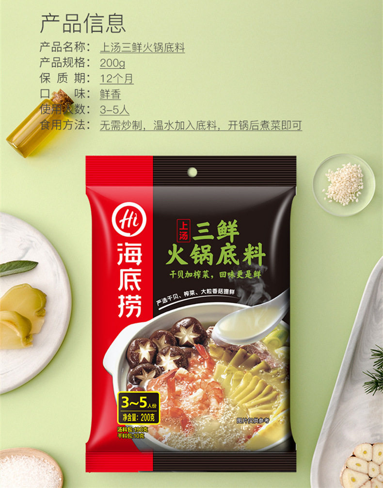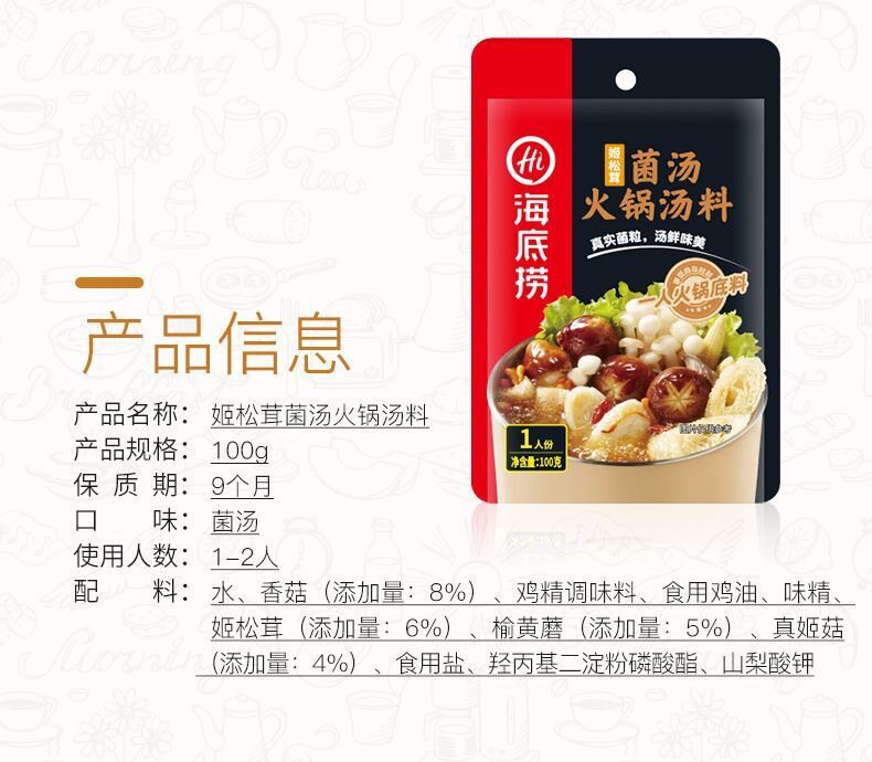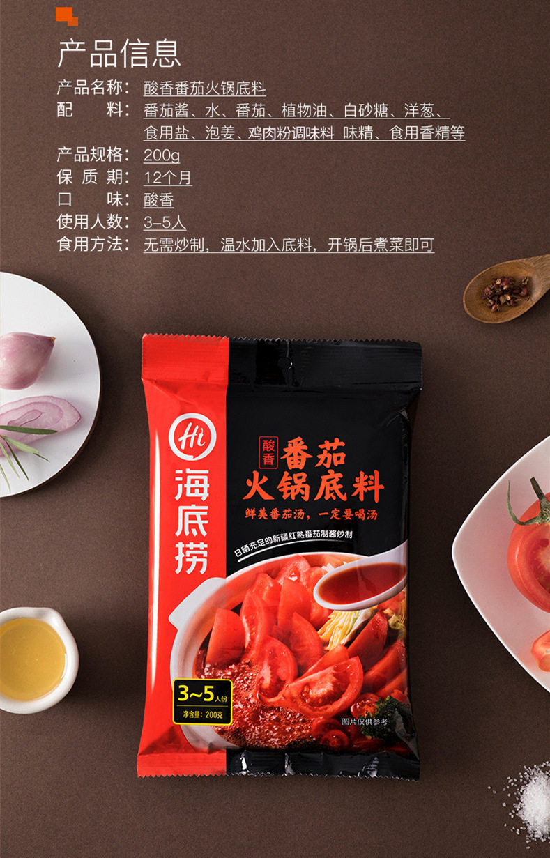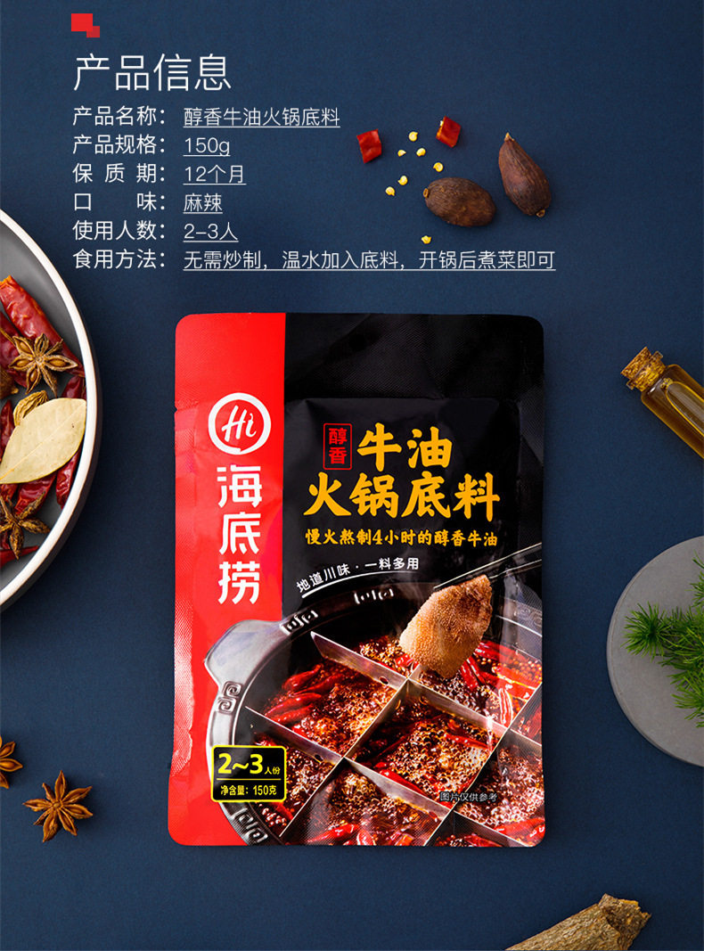 Packaging specifications 90g small piece of butter,Mellow butter 150g,Rich butter 150g,Green pepper butter 150g,Old chongqing style butter (50g*5 packs),Four small pieces of butter 360g,Spicy butter 500g,Spicy clear oil 120g,Spicy clear oil 220g,Really thick tomato hotpot ingredients 300g,Strong-flavored tomatoes 125g,Sour tomatoes 200g,Fat tomato hot pot ingredients 220g,Three delicacies in soup 100g,Three delicacies in soup 200g,Fresh and fragrant soup 110g,Beef bone flavor clear soup 200g,Mild spicy bone soup flavor hot pot ingredients 210g,Cantonese pepper pork belly chicken flavor 190g,Fresh mushroom soup 110g,Wild mushroom hot pot ingredients 100g,Yunnan style wild mushroom hot pot ingredients 140g,Large particle mushroom soup 180g,Tom yum 120g,Thai style tom yum hotpot ingredients 210g,Original hot pot dipping sauce 120g,Spicy hot pot dipping sauce 120g,Spicy hot pot dipping sauce 120g,Peanut sesame paste 100g,Beef sauce dipping 80g,Garlic dipping sauce 90g,Leek flower sauce dipping sauce 120g,Seafood flavor dipping sauce 120g,Cumin flavored dipping sauce 120g,Shacha sauce dipping 80g,[boxed] original dipping sauce 100g,[boxed] spicy dip 100g,Sauce-flavored hotpot 220g,Spicy hotpot 220g,Spicy hotpot (bone broth slightly spicy) 200g,Spicy hotpot (rich tomato flavor) 240g,Spicy hotpot (red oil spicy) 220g,Spicy crayfish 200g,Spicy crayfish 200g,Thirteen-flavored crayfish 220g,Stewed crayfish in oil 280g,Sauerkraut fish in soup 360g,Golden soup pickled fish 300g,Laotan pickled fish 370g,Premium boiled fish 210g,Fish in pickled pepper and sour soup 210g,Sour soup beef 200g,Mapo tofu 80g,Fish flavored shredded pork 100g,Boiled meat slices 100g,Sweet braised sauce 200g,Yellow braised sauce seasoning 180g,Old chengdu style self-heating hot pot 300g,Fat tomato self-heating hot pot 212g,Tomato crispy pork self-heating hot pot 275g,Spicy crispy pork self-heating hot pot 275g,Spicy vegetarian self-heating hot pot 400g,Spicy tender beef self-heating hot pot 435g,Tomato beef brisket self-heating hot pot 365g,Crispy tripe self-heating hot pot 435g,Spicy chicken self-heating rice 175g,Teriyaki chicken self-heating rice 181g,Fish-flavored shredded pork self-heating rice 187g,Stewed chicken self-heating rice 187g,Mushroom beef self-heating rice 165g,Tomato beef brisket self-heating rice 272g,Cantonese claypot self-heating rice 187g,Braised beef self-heating rice 272g,Curry beef self-heating rice 272g,Original dipping sauce (50g*3 packs),Spicy dipping sauce (50g*3 packs),Self-heating rice with roasted pepper and beef 165g