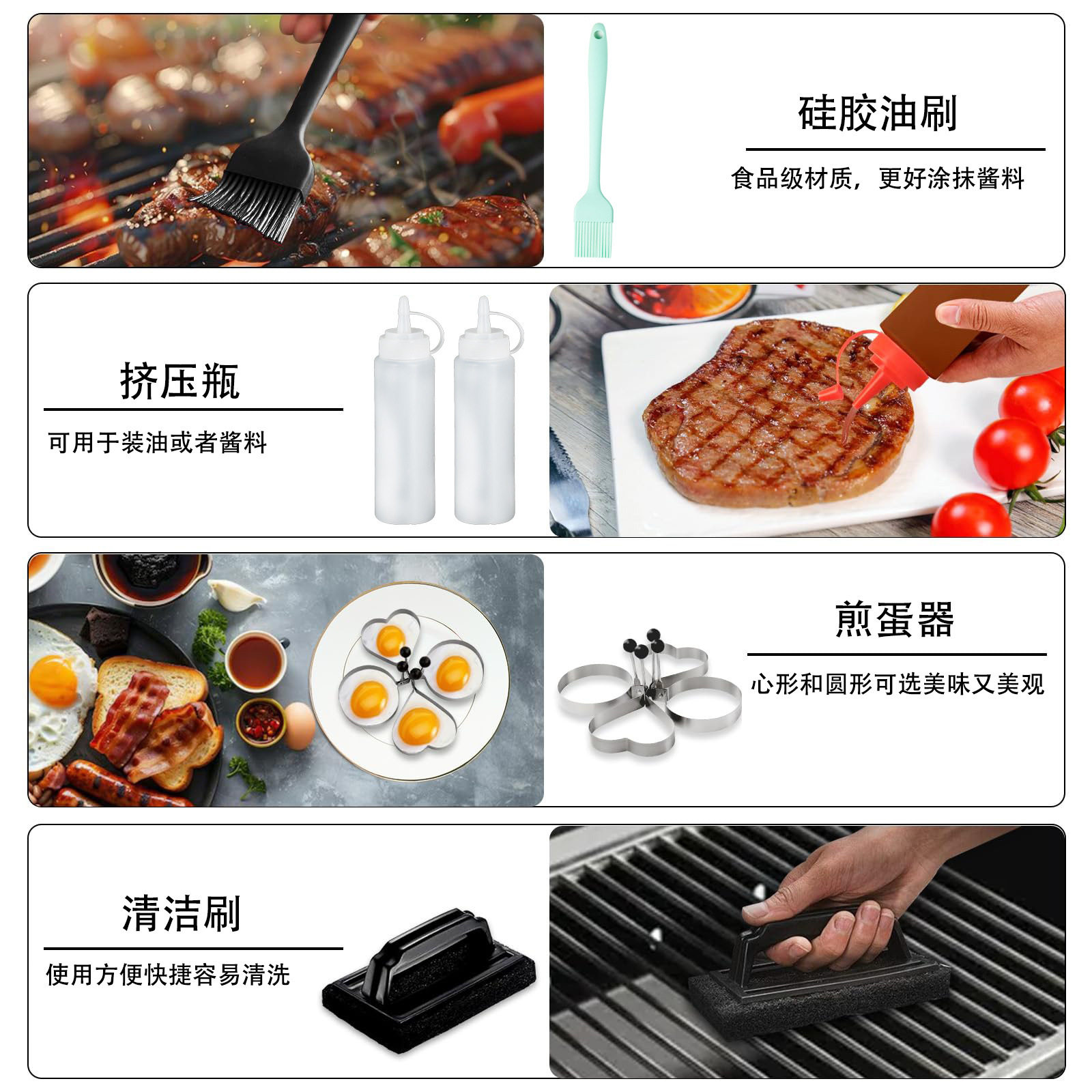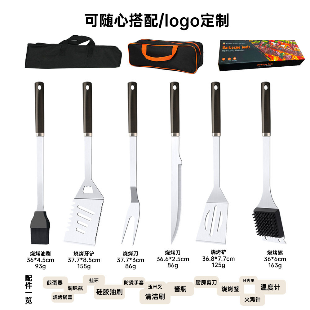 | Specification | Bbq rub (single naked outfit),Barbecue fork (single naked),Barbecue tooth shovel (single naked),Barbecue knife (single naked),Bbq oil brush (single naked),Barbecue spatula (single naked),Food clip (single naked),Six-piece set (color box),3-piece set (cloth bag),6-piece set (cloth bag),10-piece set (cloth bag),24-piece set (cloth bag) |