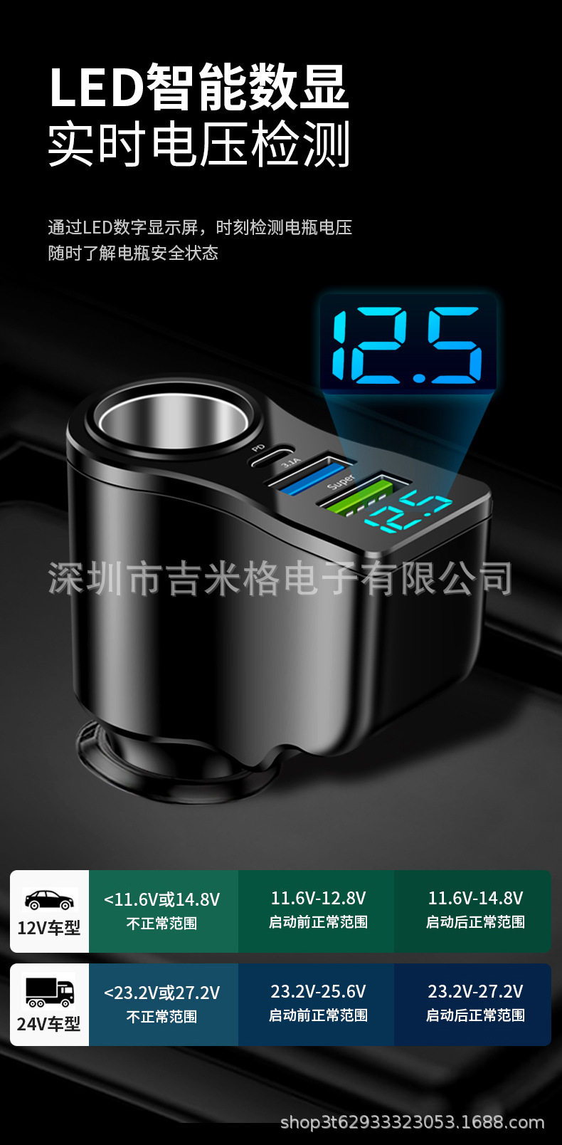 | Display | Car voltage charging voltage charging current display in turns |