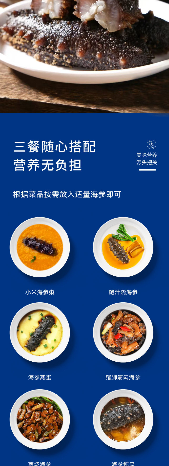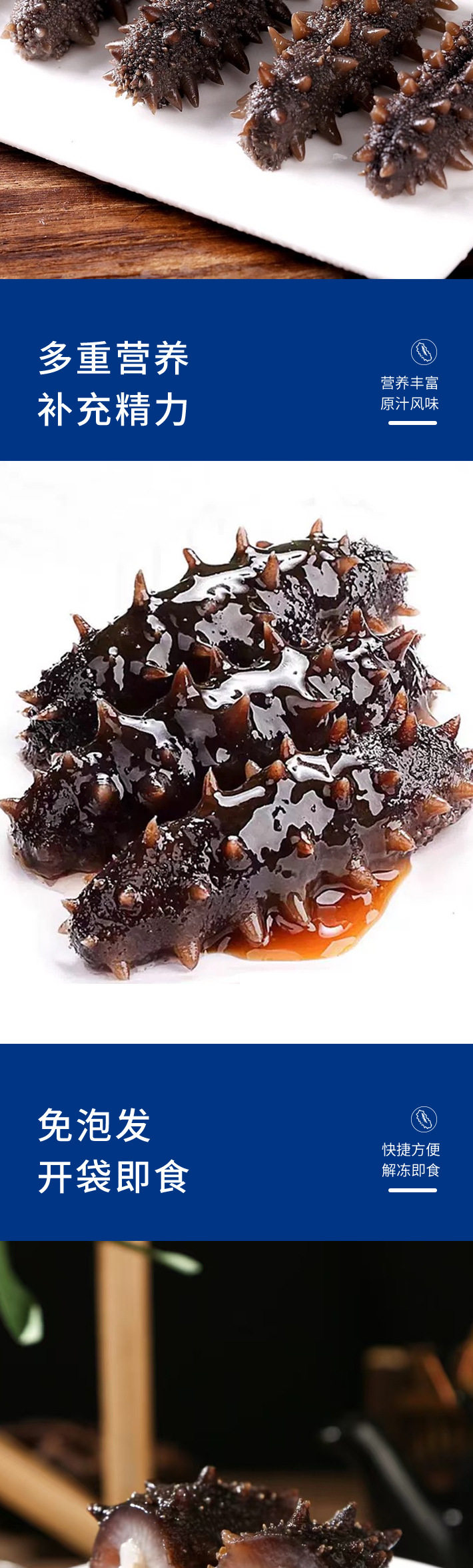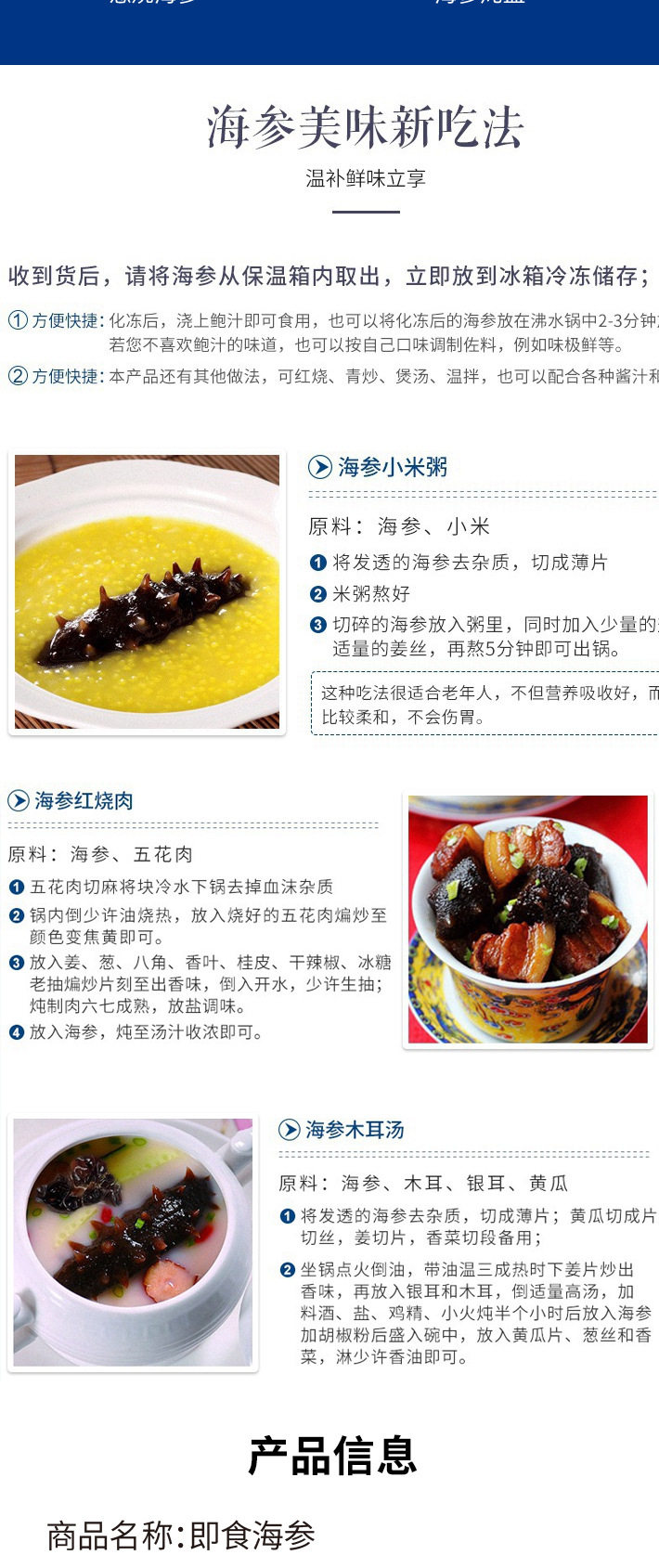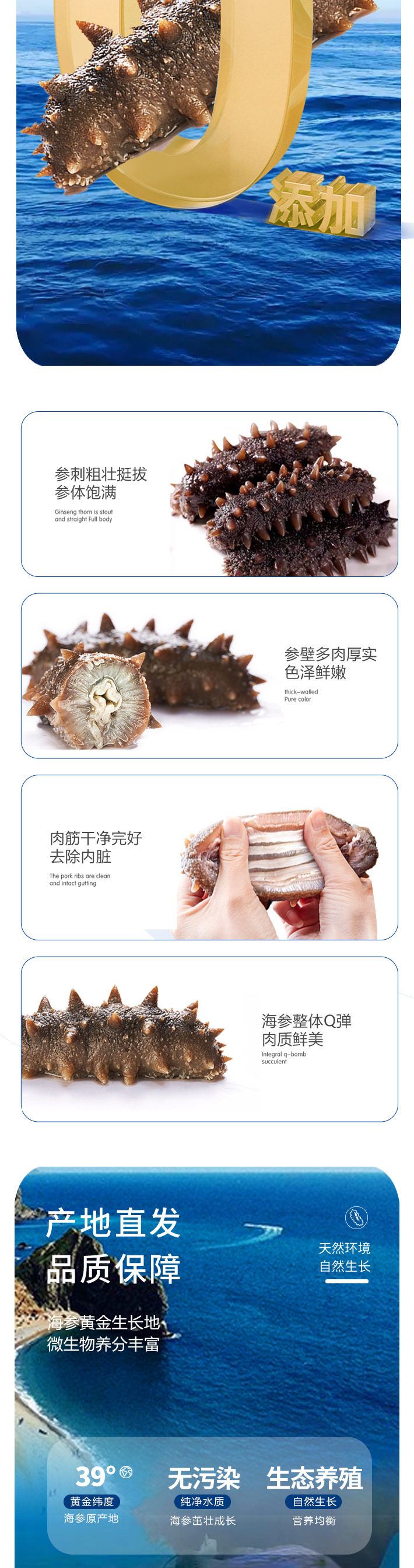 | Packaging specifications | 5-8 pieces/500g [fresh sea cucumber a-grade strong taste],8-12 pieces/500g [fresh sea cucumber a-grade strong taste],5-8 pieces/500g [fresh sea cucumber b grade soft and waxy taste],8-12 pieces/500g [fresh sea cucumber b grade soft and waxy taste],13-18 pieces/500g [fresh sea cucumber c grade ordinary taste],20-25 pieces/500g [fresh sea cucumber c grade ordinary taste],7-12 pieces/250g [fresh sea cucumber grade c ordinary taste],5-8 pieces/500g [fresh sea cucumber grade a gift box],8-12 pieces/500g [fresh sea cucumber grade a gift box],40-60 heads/250g [national standard light dried sea cucumber],40-60 heads/500g [national standard light dried sea cucumber],40-60 heads/250g [national standard light dried sea cucumber gift box],40-60 heads/500g [national standard light dried sea cucumber gift box],8-12 pieces/500g [eggplant ginseng],20-30 pieces/500g [eggplant ginseng] |