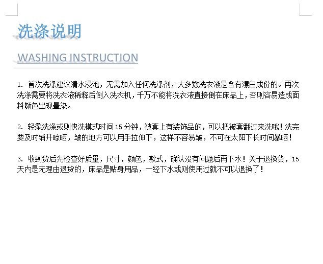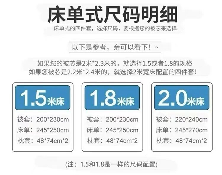 | Dimensions | 1.2m bed sheet three-piece set (applicable to 150*200 quilt core),1.5m bed sheet four-piece set (applicable to 200*230 quilt core),1.8m bed sheet four-piece set (applicable to 200*230 quilt core),2m bed sheet four-piece set (applicable to 220*240 cores),1.2m fitted sheet three-piece set (applicable to 150*200 quilt core),1.5m fitted sheet set of four (applicable to 200*230 quilt core),1.8m fitted sheet set of four (applicable to 200*230 quilt core),1.8m fitted sheet model, four-piece set (applicable to 220*240 quilt core) |
