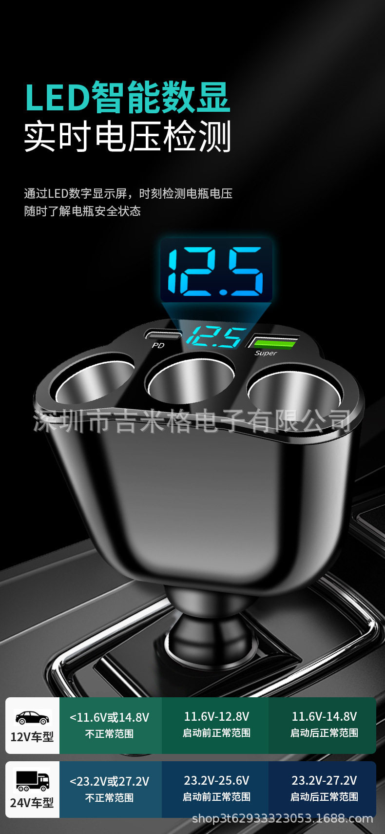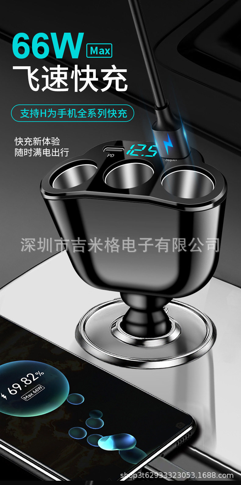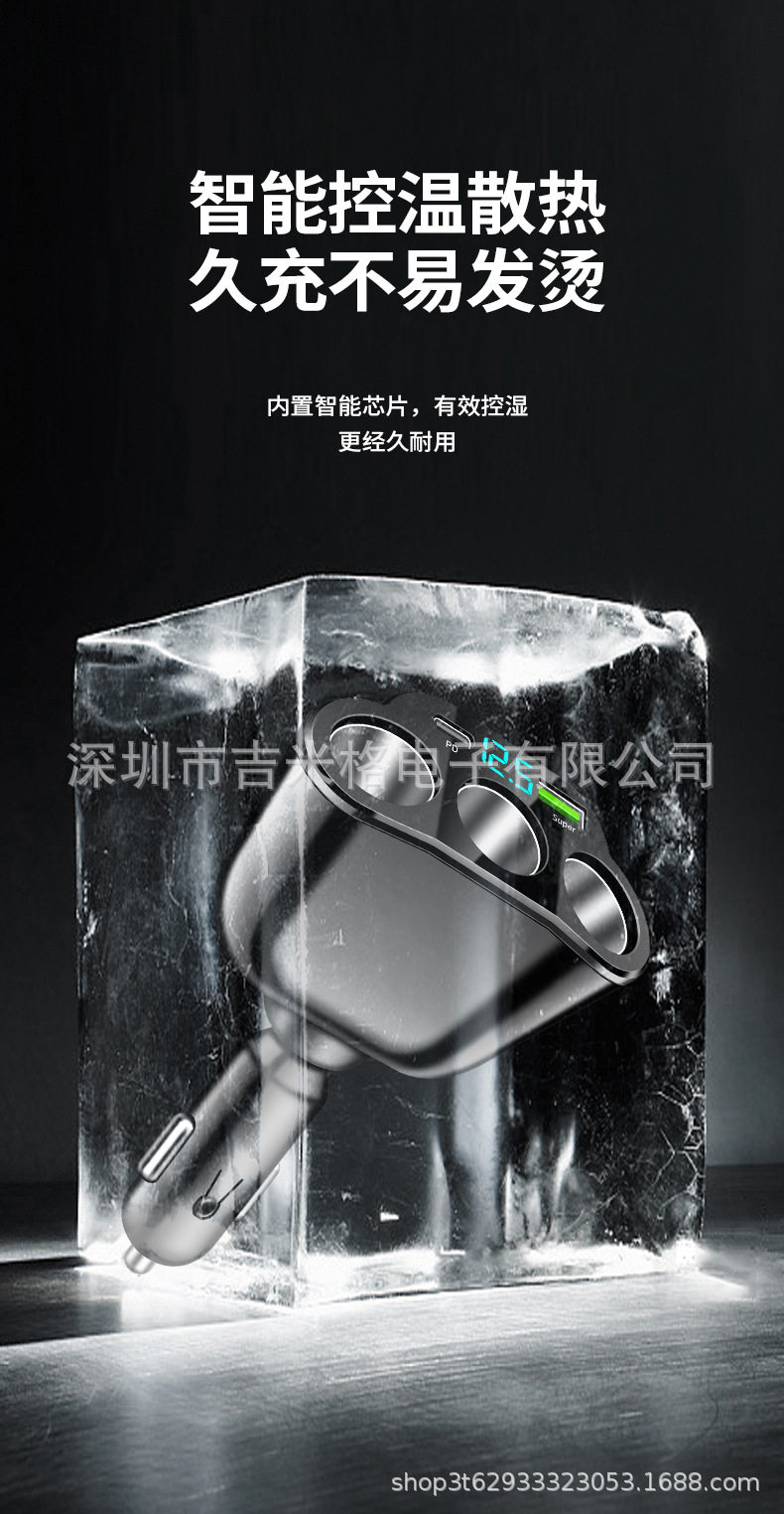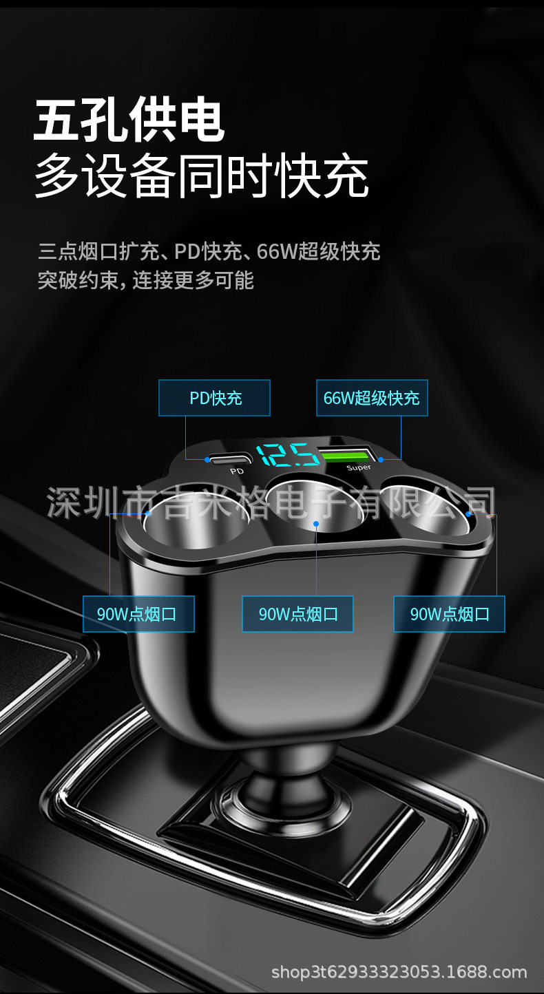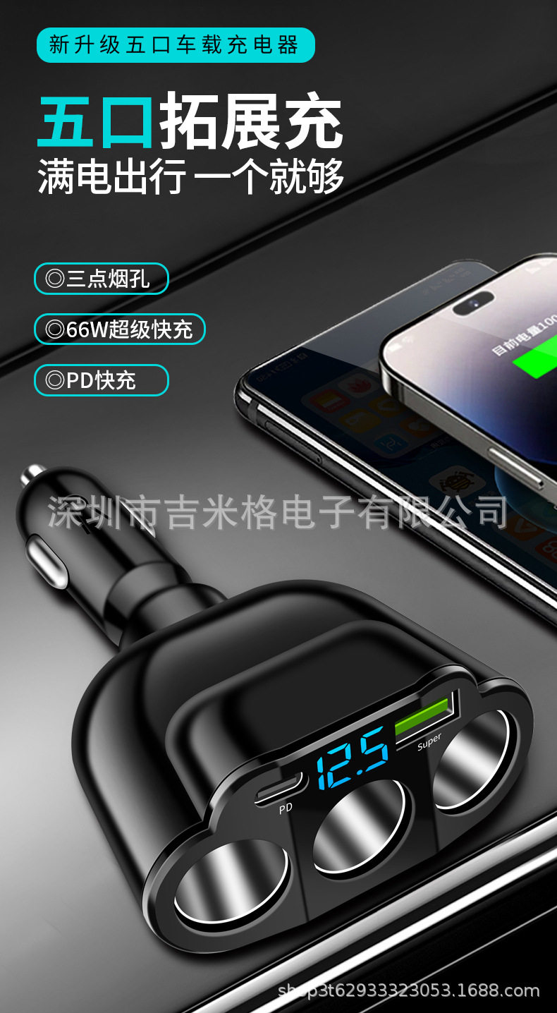New digital display car fast charging dual USB car charger car one drag three cigarette lighter 66W car multifunctional charger