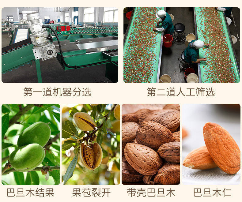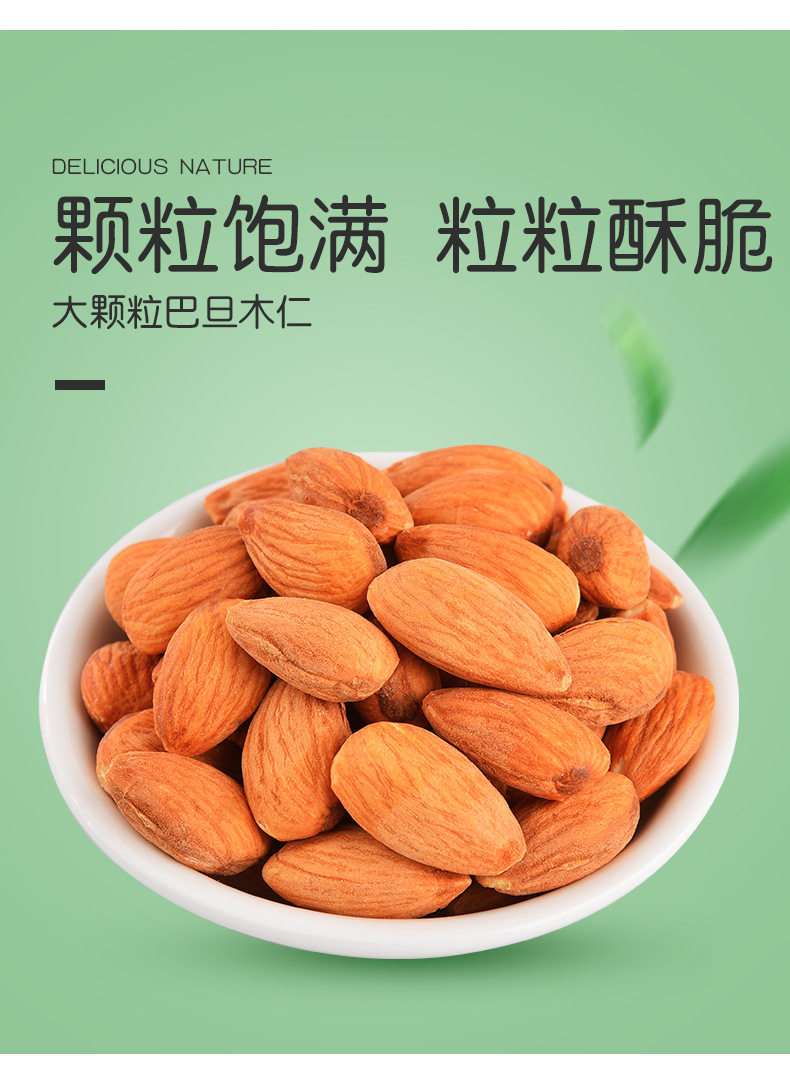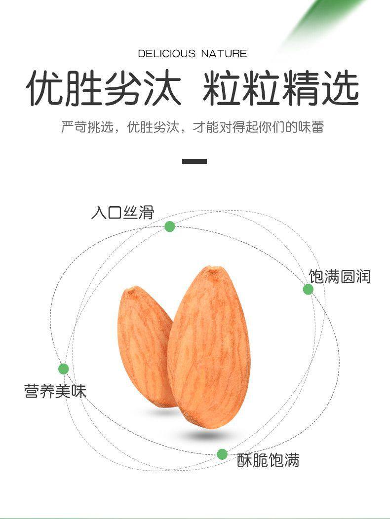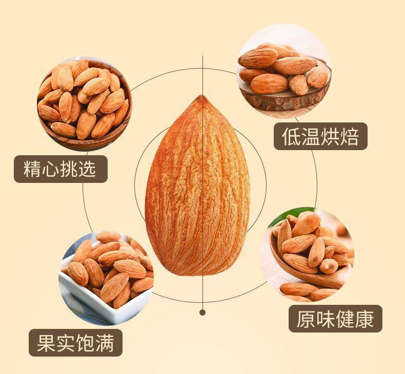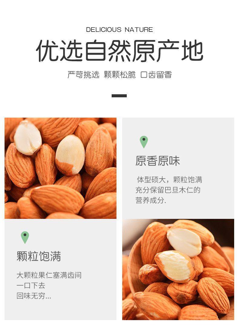 | Packaging specifications | âHealthy and deliciousâ1 bag of almonds [250g],â Healthy and deliciousâ 2 bags of almonds [500g],âHealthy and deliciousâ4 bags of almonds [1000g],â Healthy and deliciousâ 1 can of almonds [net 150g],âHealthy and deliciousâ2 cans of almonds [net 300g],â Healthy and deliciousâ 4 cans of almonds [net 600g],[dropshipping] contact customer service for better prices |