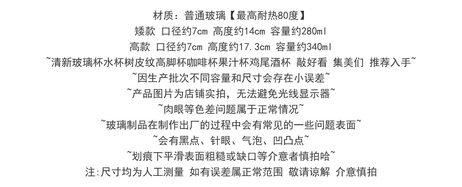 | Color | Transparent goblet [short style],Transparent goblet [tall style],Bark pattern goblet [short style],Bark pattern goblet [tall style],Striped goblet [short style],Striped goblet [tall style] |