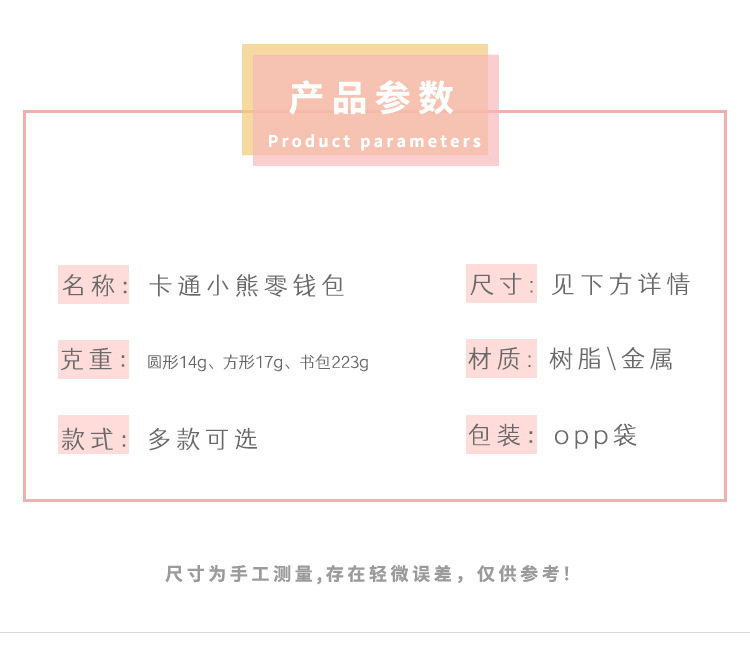 | Color | Round style - shoulder bag bear,Round style-apron bear,Round style-big-faced bear,Square style-shoulder bag bear,Square style-apron bear,Square style-big-faced bear,School bag style - shoulder bag bear,School bag style-apron bear,Schoolbag style-big-faced bear |