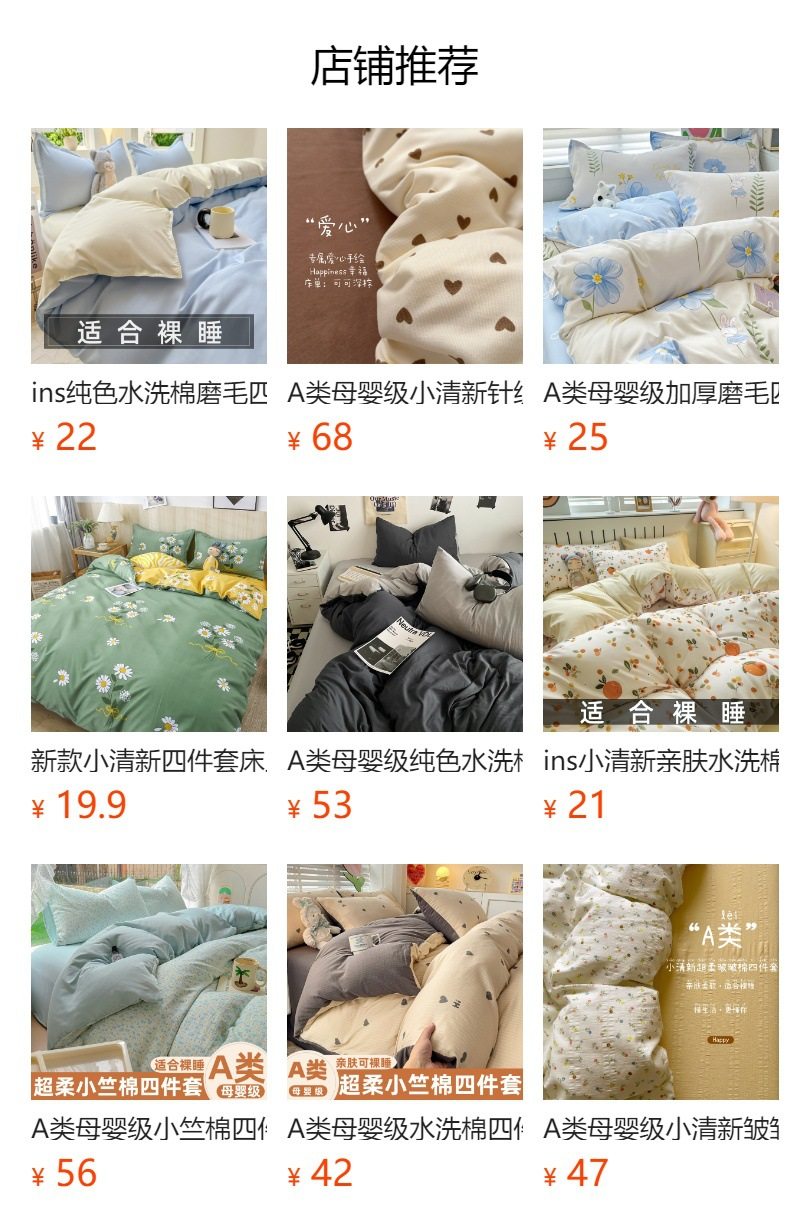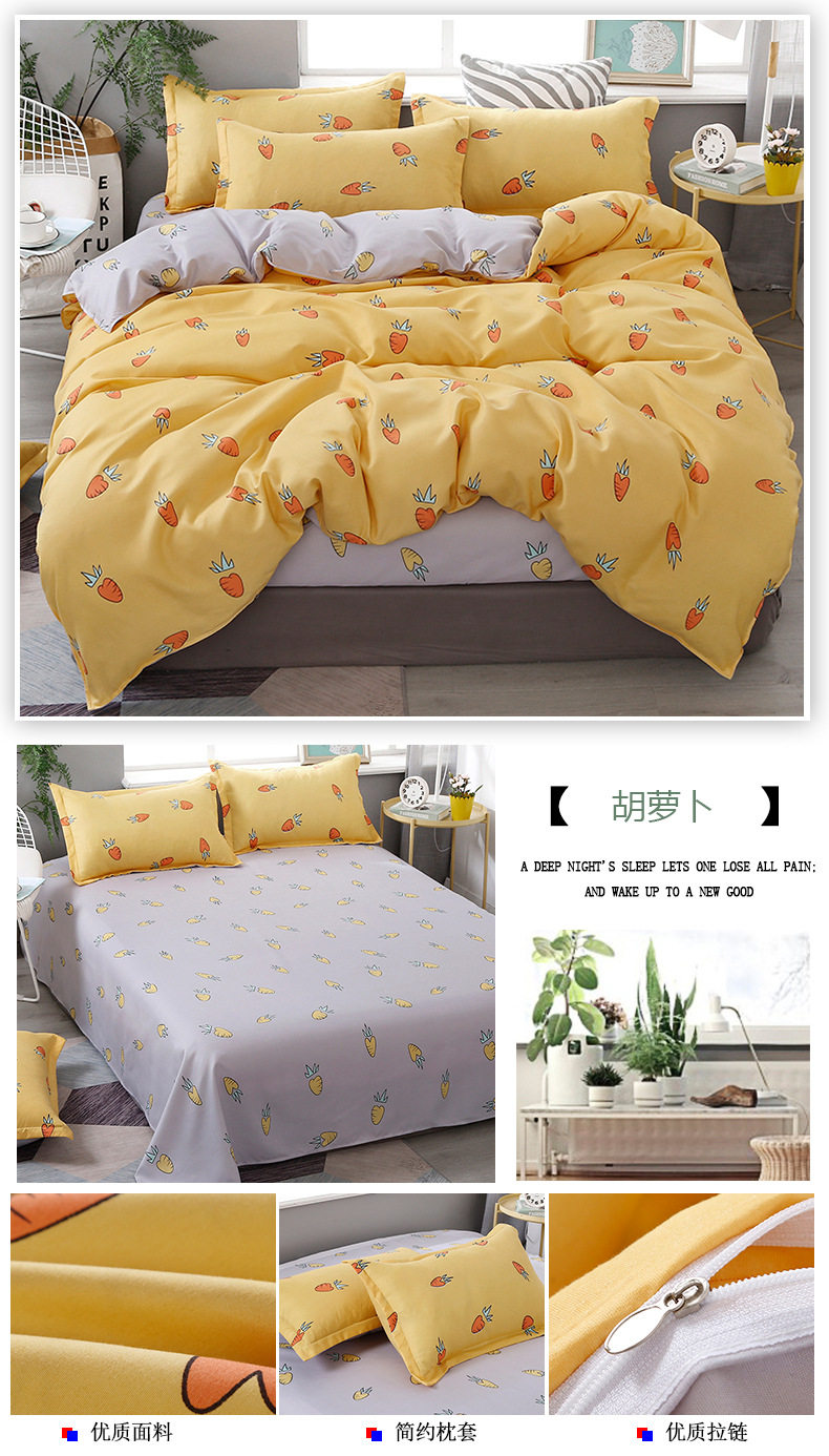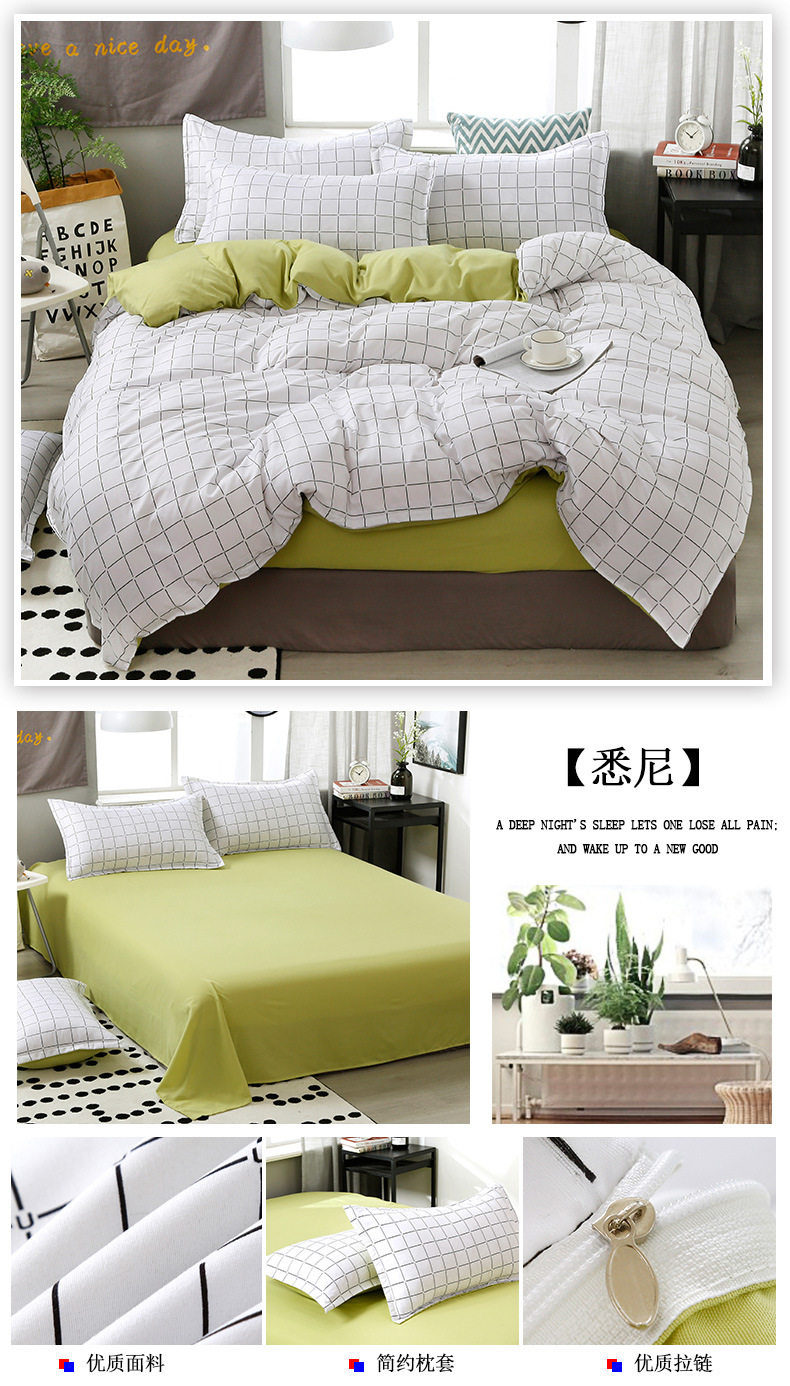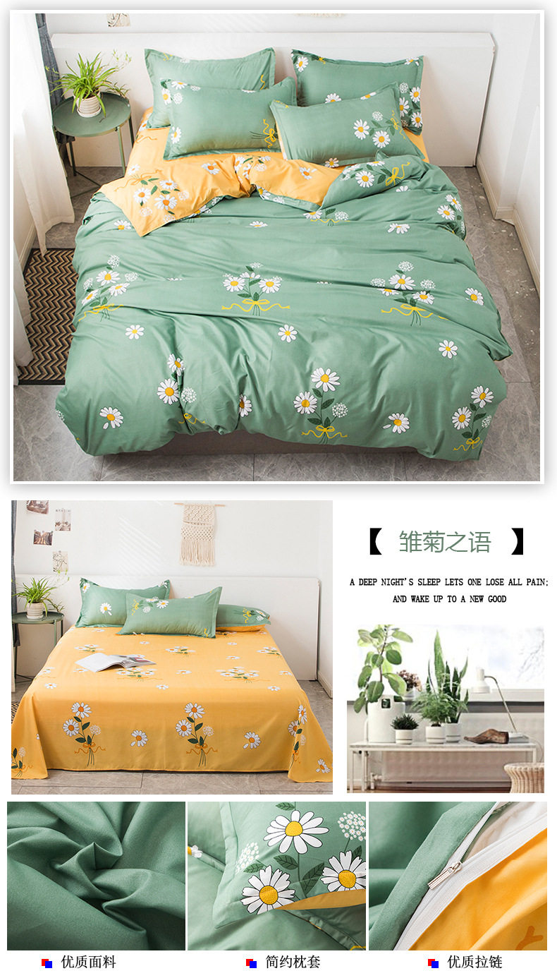 | Dimensions | 1.5m piece set - quilt cover 150*200cm, bed sheet 160*230cm, pillowcase 48*74cm,1.9m piece set - quilt cover 150*200cm, bed sheet 200*230cm, pillowcase 48*74cm pair,2.2m piece set - quilt cover 180*220cm, sheets 230*230cm, pillowcases 48*74cm pair,2.4m piece set - quilt cover 200*230cm, bed sheet 230*230cm, pillowcase 48*74cm pair,Single quilt cover 150*200cm,Single quilt cover 180*220cm,Single quilt cover 200*230cm |