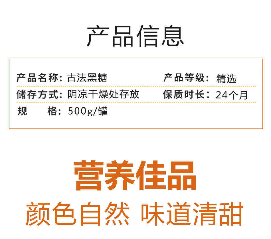| Packaging specifications | 【1 can】original brown sugar (500g),【1 can】old ginger brown sugar (500g),【1 can】rose brown sugar (500g),【1 can】red dates and brown sugar (500g),【2 cans】original brown sugar (1000g) |