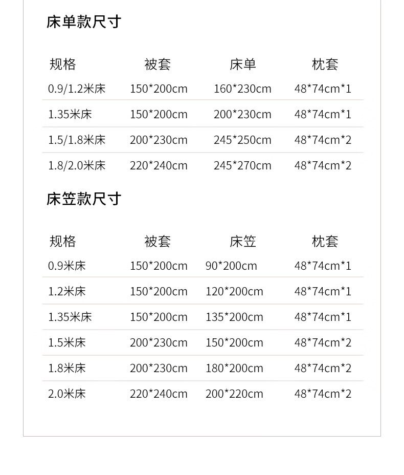 | Dimensions | Quilt cover: 150x200cm [applicable to 150x200 quilt],Quilt cover: 180x200cm [applicable to 180x200 quilt],Quilt cover: 200x230cm [applicable to 200x230 quilt],Quilt cover: 220x240cm [applicable to 220x240 quilt],Quilt cover: 150x200cm + a pair of pillowcases of the same color,Quilt cover: 180x200cm + a pair of pillowcases of the same color,Quilt cover: 200x230cm + a pair of pillowcases of the same color,Quilt cover: 220x240cm + a pair of pillowcases of the same color,1.2m [three-piece bed sheet set] - used with 150x200 quilt,1.8m [four-piece bed sheet set] - used with 200x230 quilt,2.0m [four-piece bed sheet set] - used with 220x240 quilt,1.2m [three-piece fitted sheet set] - used with 150x200 quilt,1.5m [four-piece fitted sheet set] - used with 200x230 quilt,1.8m [four-piece fitted sheet set] - used with 200x230 quilt,2.0m [four-piece set of extra-large quilt cover and fitted sheet] - used with 220x240 quilt |