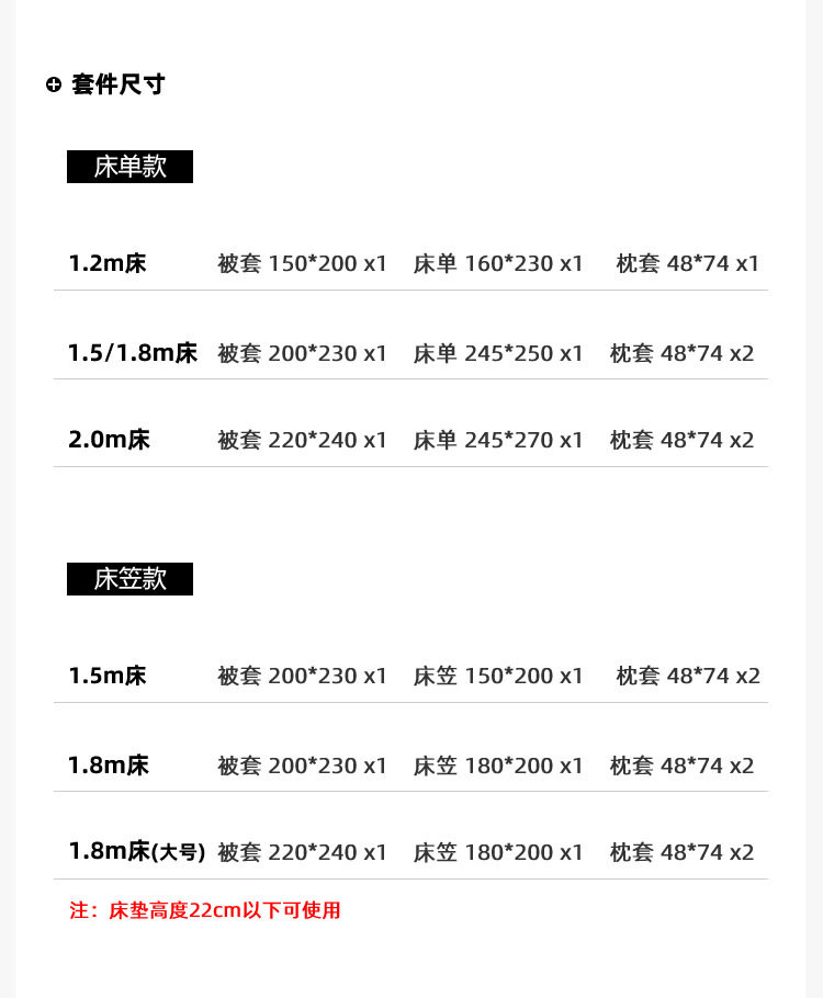 | Dimensions | 1.2m bed/quilt cover 150*200cm/three-piece set,1.5m bed/quilt cover 200*230cm/four-piece set,1.8m bed/quilt cover 200*230cm/four-piece set,2.0m bed/quilt cover 220*240cm/four-piece set,1.5m bed/quilt cover 200*230cm/four-piece set [fitted sheet],1.8m bed/quilt cover 200*230cm/four-piece set [fitted sheet] |
