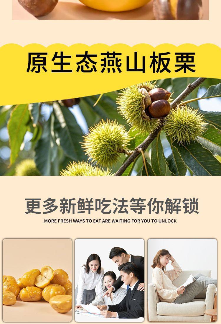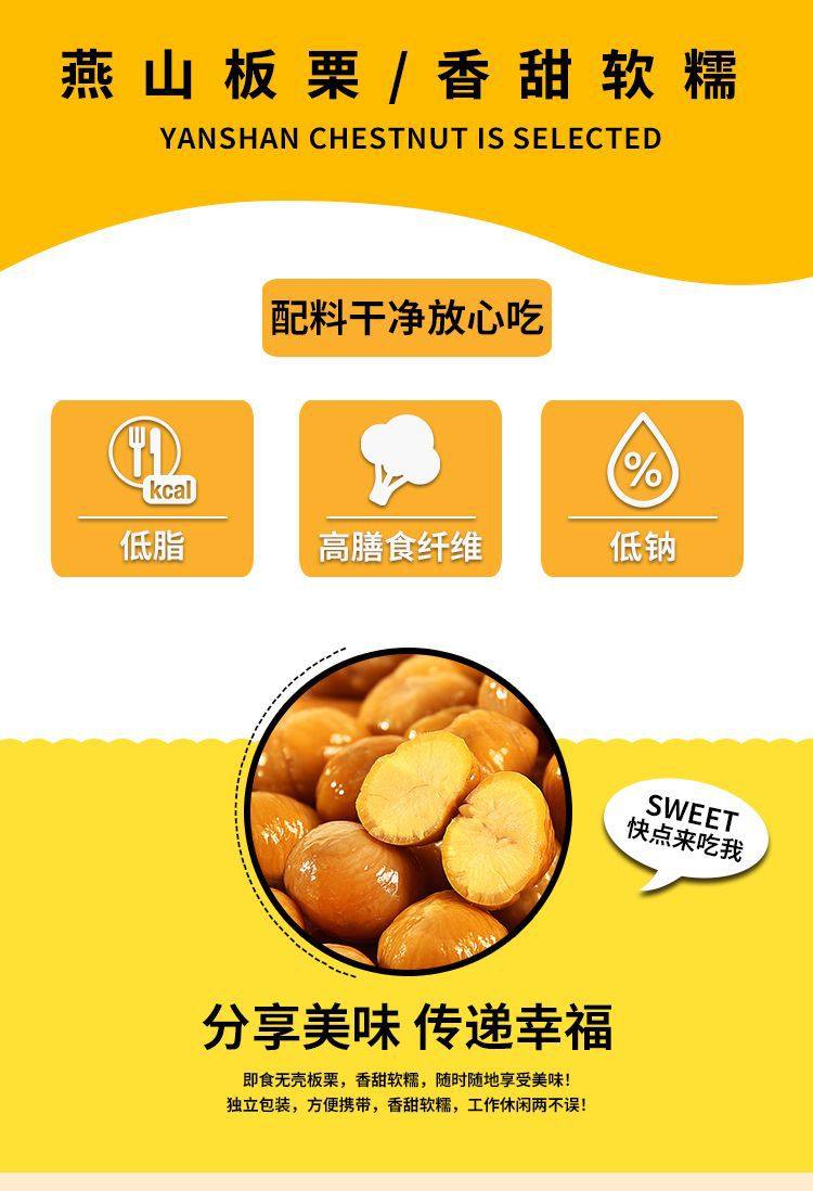 Packaging specifications 10 bags of chestnuts (about 250 grams) [selected yanshan chestnuts],20 bags of chestnuts (about 500 grams) [clean ingredients],32 bags of chestnuts (about 800 grams) [sweet and soft],40 bags of chestnuts (about 1000 grams) [ready to eat after opening the bag]