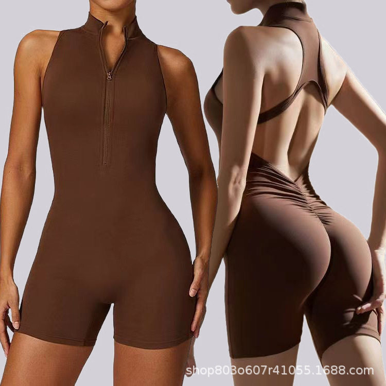 Cross-border European and American Quick-drying Pleated Jumpsuit Shorts Women's Peach Hip Jumpsuit No Embarrassment Line Tight Zipper Yoga Pants