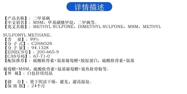 in stock supply food grade MSM dimethyl sulfone 99% 60-80 mesh (salt thickness) dimethyl sulfone