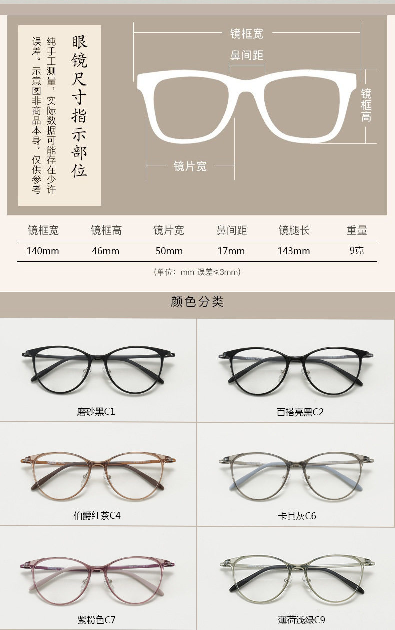 | Frame color | Matte black c1,Versatile bright black c2,Earl gray tea c4,Khaki gray c6,Purple pink c7,Mint light green c9 |