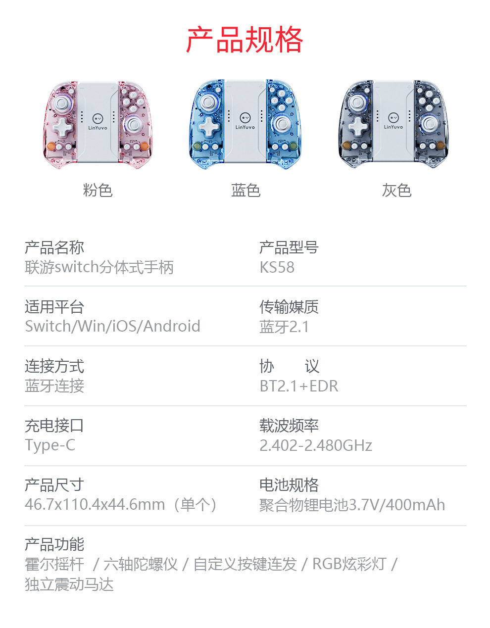 | Product color | Hall rocker+transparent blue,Hall rocker+transparent pink,Hall rocker+transparent gray |