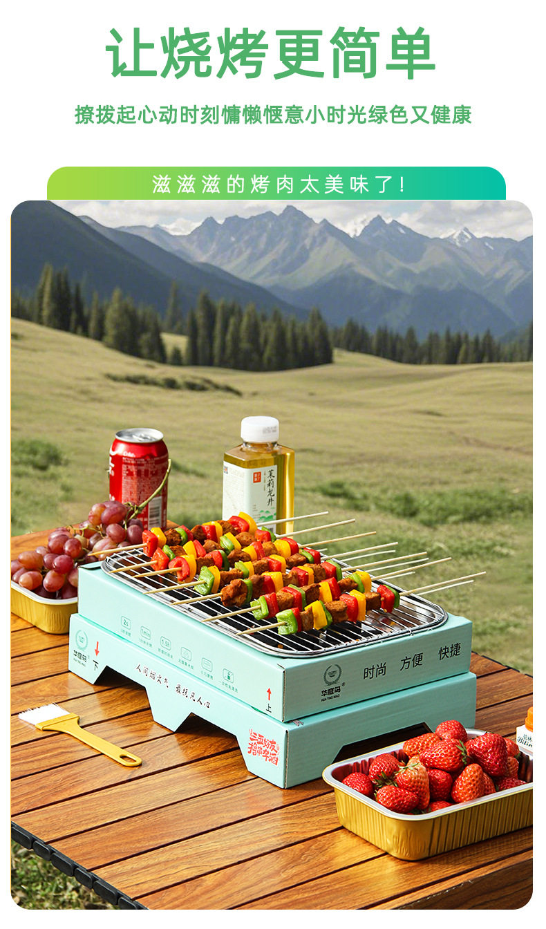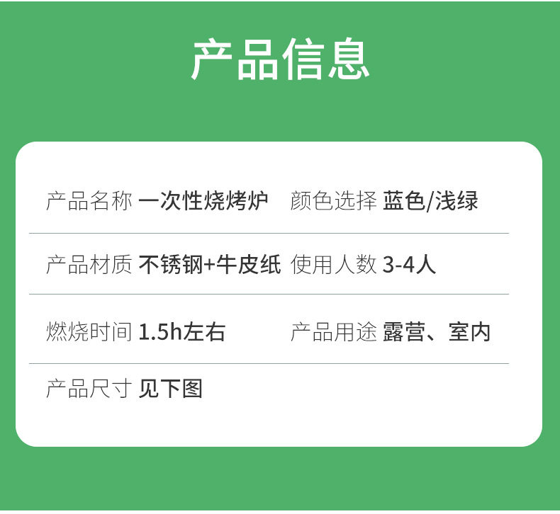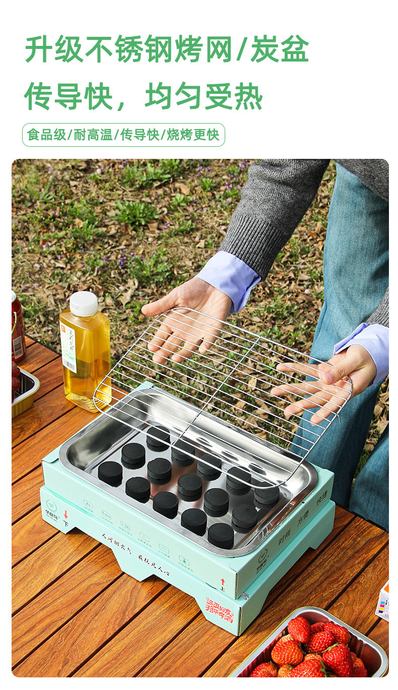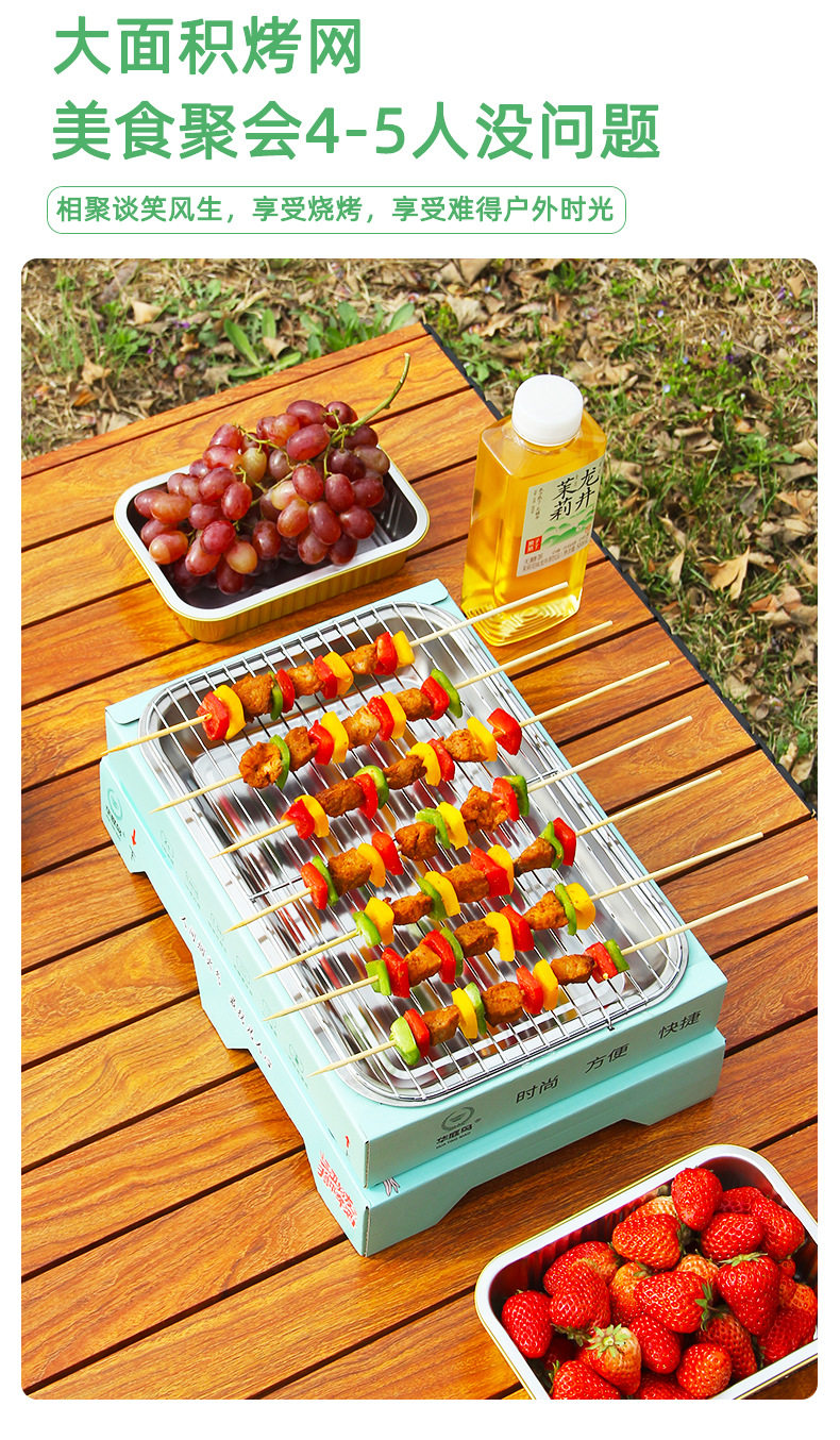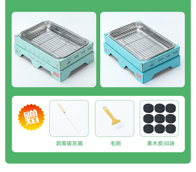 | Grill/plate specifications | Sky blue disposable oven [vertical grilling grid],Light green disposable oven [vertical grill grid],Sky blue disposable oven [grid grill],Light green disposable oven [grid grill],30 spare fruit charcoal (3 packs),Large sky blue disposable oven [grid grill],Large light green disposable oven [grid grill] |