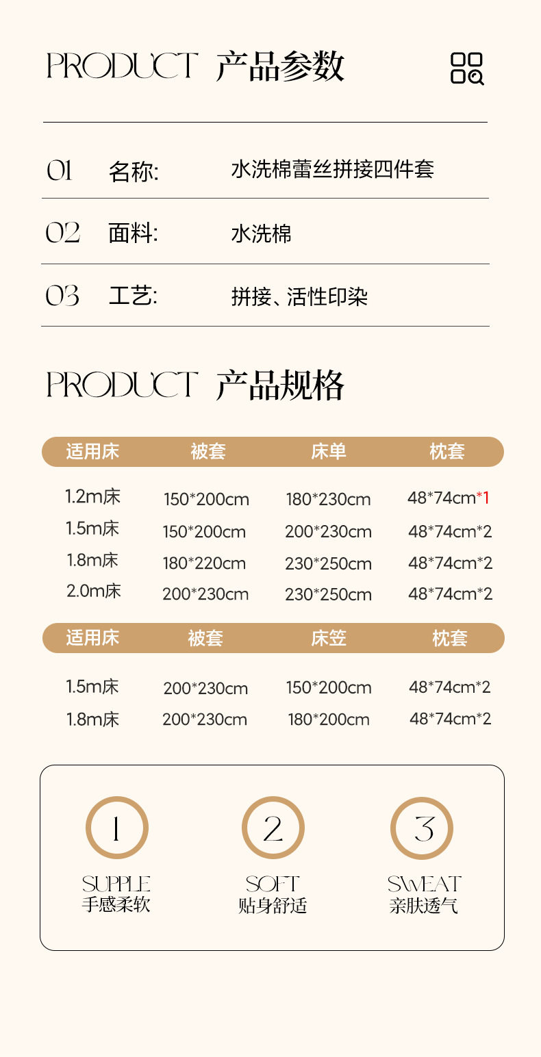 | Dimensions | 0.9m dormitory bed [three-piece bed sheet set] - suitable for 150x200cm quilt core,1.2m bed [three-piece bed sheet set] - suitable for 150x200cm quilt core,1.5m bed [sheet set of four pieces] - suitable for 150x200cm quilt core,1.5m bed [sheet set of four pieces] - suitable for 180x220cm quilt core,1.5m bed [sheet set of four pieces] - suitable for 200x230cm quilt core,1.8m bed [sheet set of four pieces] - suitable for 200x230cm quilt core,2.0m bed [sheet set of four pieces] - suitable for 200x230cm quilt core,1.5m bed [four-piece fitted sheet set] - suitable for 180x220cm quilt core,1.5m bed [four-piece fitted sheet set] - suitable for 200x230cm quilt core,1.8m bed [four-piece fitted sheet set] - suitable for 180x220cm quilt core,1.8m bed [four-piece fitted sheet set] - suitable for 200x230cm quilt core |