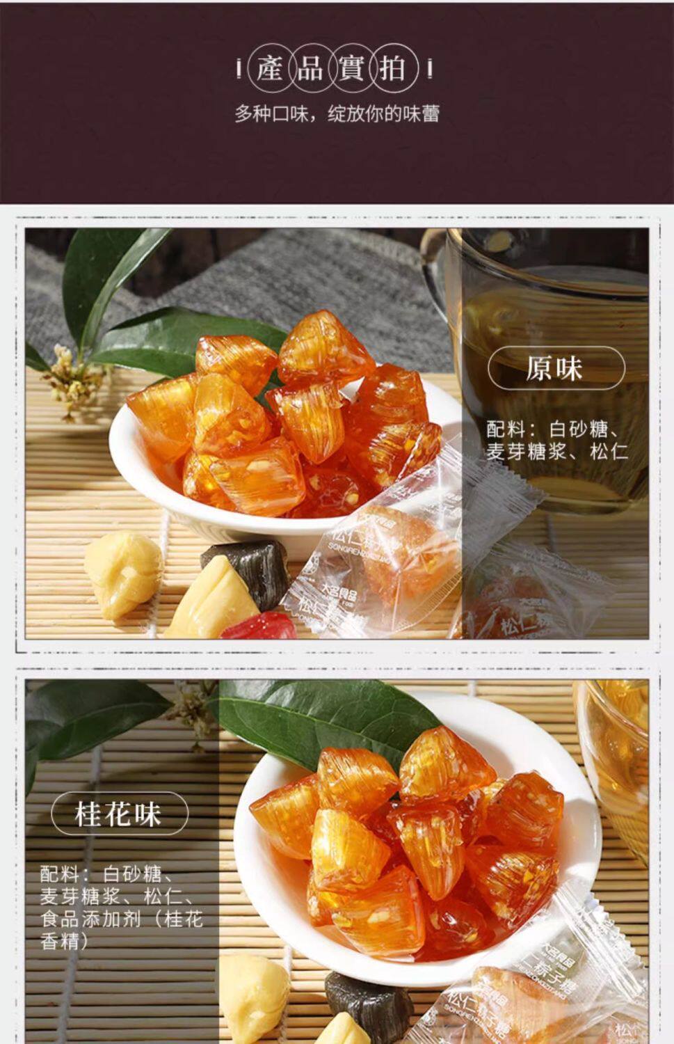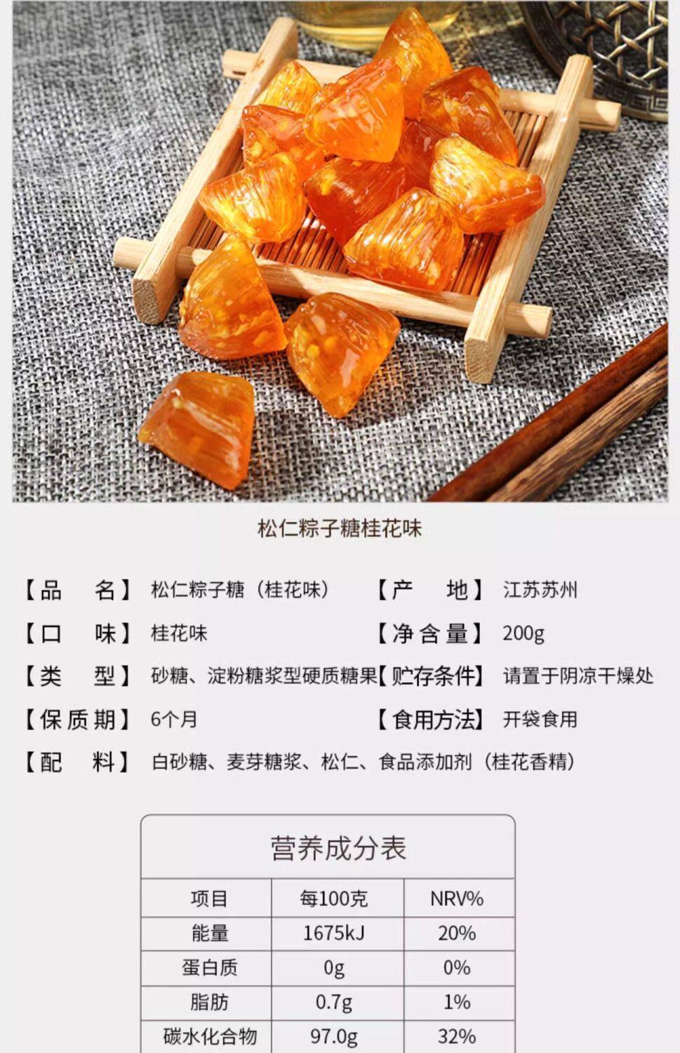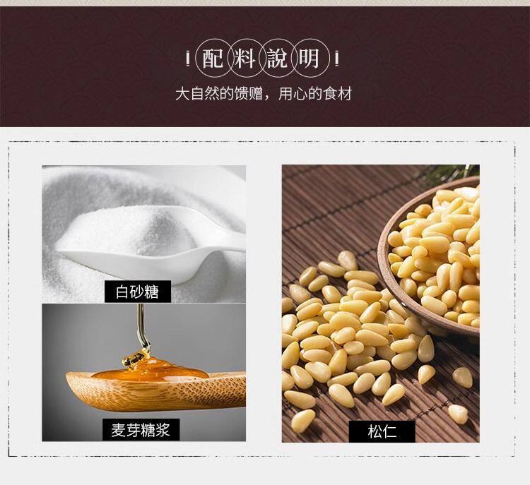 | Packaging specifications | Pine nut rice dumpling candy original flavor-201g-1 bag,Pine nut rice dumpling candy with osmanthus flavor-201g-1 bag,Pine nut rice dumpling candy mint flavor-201g-1 bag,Glutinous rice dumpling candy without pine nuts and black sesame flavor-201g-1 bag,No pine nut rice dumpling candy rose flavor-201g-1 bag,Old-fashioned maltose-201g-1 bag,Old-fashioned ginger candy-201g-1 bag,Old-fashioned pear paste candy-201g-1 bag |