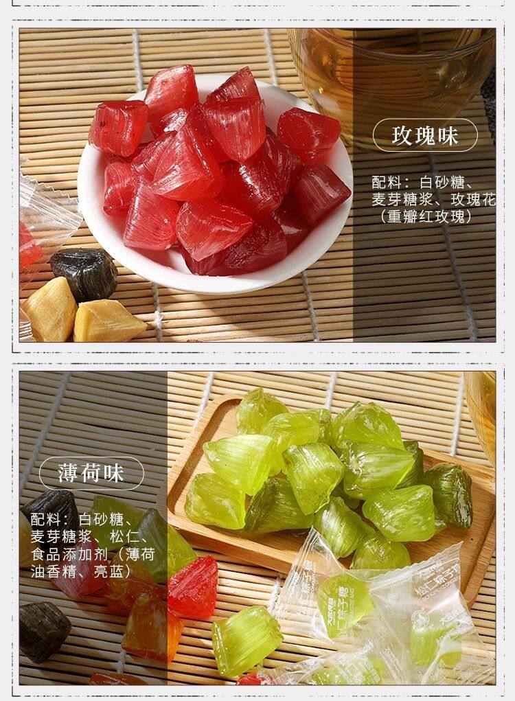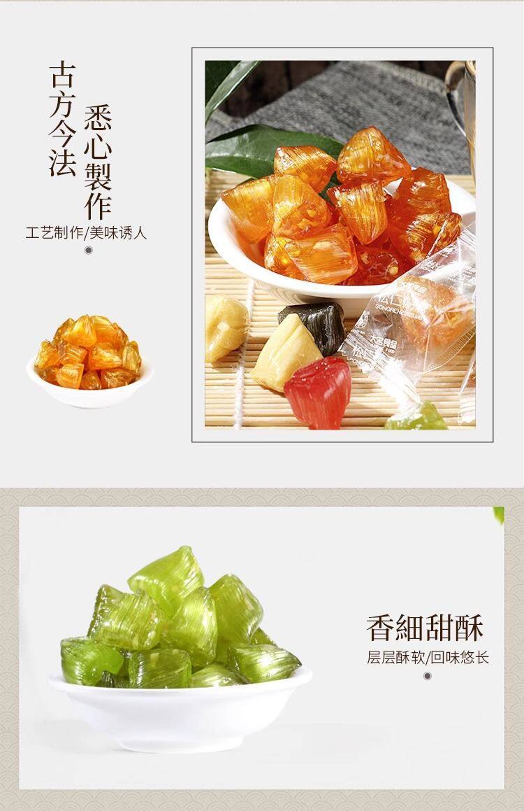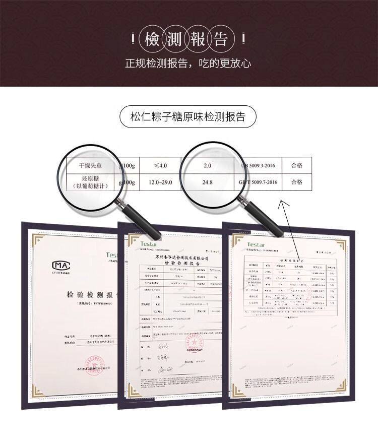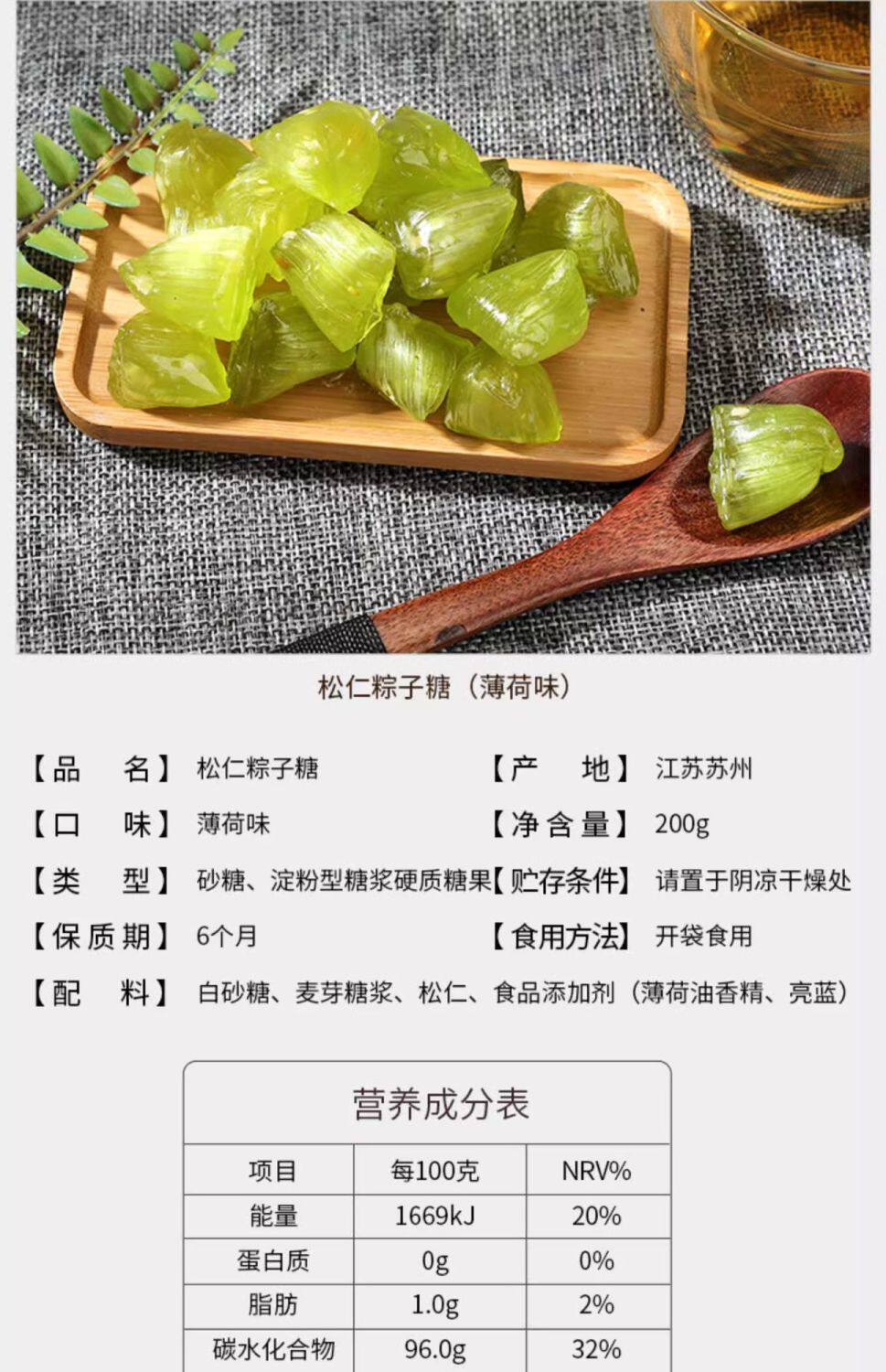 | Packaging specifications | Pine nut rice dumpling candy original flavor-201g-1 bag,Pine nut rice dumpling candy with osmanthus flavor-201g-1 bag,Pine nut rice dumpling candy mint flavor-201g-1 bag,Glutinous rice dumpling candy without pine nuts and black sesame flavor-201g-1 bag,No pine nut rice dumpling candy rose flavor-201g-1 bag,Old-fashioned maltose-201g-1 bag,Old-fashioned ginger candy-201g-1 bag,Old-fashioned pear paste candy-201g-1 bag |