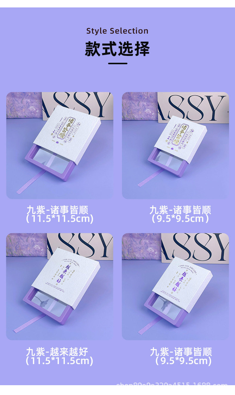 | Specifications and models | Getting better all the time / deep purple hot stamping + purple floating inner box; 9.5*9.5*2.5cm / inner box with floating film sleeve,Getting better all the time / deep purple hot stamping + purple floating inner box; 11.5*11.5*2.5cm / inner box with floating film sleeve,Everything goes smoothly/hot matte gold + purple suspended inner box; 9.5*9.5*2.5cm/inner box with suspended film box,Everything goes smoothly/hot matte gold + purple suspended inner box; 11.5*11.5*2.5cm/inner box with suspended film box,Princess, please make a fortune/dark purple hot stamping + purple suspended inner box; 9.5*9.5*2.5cm/inner box with suspended film box,Princess, please make a fortune/dark purple hot stamping + purple suspended inner box; 11.5*11.5*2.5cm/inner box with suspended film box,Princess, please make a fortune/hot-melt gold + purple floating inner box; 9.5*9.5*2.5cm/inner box with floating film box,Princess, please make a fortune/hot matte gold + purple suspended inner box; 11.5*11.5*2.5cm/inner box with suspended film box,Princess, please make a fortune/hot matte gold + grass green suspended inner box; 9.5*9.5*2.5cm/inner box with suspended film box,Princess, please make a fortune/hot-melt gold + grass green suspended inner box; 11.5*11.5*2.5cm/inner box with suspended film box,Princess, please make a fortune/hot-melt gold + teal floating inner box; 9.5*9.5*2.5cm/inner box with floating film box,Princess, please make a fortune/hot-melt gold + teal suspended inner box; 11.5*11.5*2.5cm/inner box with suspended film box,Princess, please make a fortune/hot-melt gold + red floating inner box; 9.5*9.5*2.5cm/inner box with floating film box,Princess, please make a fortune/hot matte gold + red suspended inner box; 11.5*11.5*2.5cm/inner box with suspended film box,Money likes me/dark purple hot stamping + purple suspended inner box; 9.5*9.5*2.5cm/inner box with suspended film box,Money likes me/dark purple hot stamping + purple suspended inner box; 11.5*11.5*2.5cm/inner box with suspended film box,Money likes me/hot matte gold + grass green suspended inner box; 9.5*9.5*2.5cm/inner box with suspended film box,Money likes me/hot matte gold + grass green suspended inner box; 11.5*11.5*2.5cm/inner box with suspended film box,Money likes me/hot matte gold + red suspension box; 9.5*9.5*2.5cm/inner box with suspension film box,Money likes me/hot matte gold + red suspension box; 11.5*11.5*2.5cm/inner box with suspension film box,Money likes me/hot matte gold + blue-green suspension box; 9.5*9.5*2.5cm/inner box with suspension film box,Money likes me/hot matte gold + blue-green suspension box; 11.5*11.5*2.5cm/inner box with suspension film box,Get rich/red hot stamping + hot matte gold + red suspended inner box; 9.5*9.5*2.5cm/inner box with suspended film box,Get rich/red hot stamping + hot matte gold + red suspended inner box; 11.5*11.5*2.5cm/inner box with suspended film box,Gold attraction/red hot stamping + matte gold hot stamping + red floating inner box; 9.5*9.5*2.5cm/inner box with floating film sleeve,Gold attraction/red hot stamping + matte gold hot stamping + red floating inner box; 11.5*11.5*2.5cm/inner box with floating film sleeve,Black rich/hot matt gold + black suspended inner box; 9.5*9.5*2.5cm/inner box with suspended film box,Black rich/hot matt gold + black suspended inner box; 11.5*11.5*2.5cm/inner box with suspended film box,Black everything goes smoothly/hot matt gold + black suspended inner box; 9.5*9.5*2.5cm/inner box with suspended film box,Black everything goes smoothly/hot matt gold + black suspended inner box; 11.5*11.5*2.5cm/inner box with suspended film box,I'm just lucky/hot matte gold + fruit green suspended inner box; 9.5*9.5*2.5cm/inner box with suspended film box,I'm just lucky/hot matte gold + fruit green suspended inner box; 11.5*11.5*2.5cm/inner box with suspended film box,I'm just lucky/hot matte gold + red suspension box; 9.5*9.5*2.5cm/inner box with suspension film box,I'm just lucky/hot matte gold + red suspension box; 11.5*11.5*2.5cm/inner box with suspension film box,I'm just lucky/hot matte gold + blue-green suspension; 9.5*9.5*2.5cm/inner box with suspension film box,I'm just lucky/hot matte gold + blue-green suspension; 11.5*11.5*2.5cm/inner box with suspension film box,I just have a good life/handbag/double copper paper; 20*15*6cm/handbag size,Princess please get rich/handbag/double copper paper; 20*15*6cm/handbag size,Everything goes smoothly/handbag/double copper paper; 20*15*6cm/handbag size,Get rich quick/tote bag/double copper paper; 20*15*6cm/tote bag size,Black tote bag / double copper paper; 12*16*6cm / tote bag dimensions,Princess, please make a fortune/handbag/hand-kneaded paper; 12*15*6cm/handbag size,Get rich immediately/handbag/special paper; 12*15*6cm/handbag size,Get rich immediately/handbag/special paper; 12*15*6cm/handbag size,Black/small/handbag/hand-kneaded paper; 12*15*6cm/handbag size,White/small size/handbag/hand-kneaded paper; 12*15*6cm/handbag size,Black / large / tote bag / handmade paper; 17*18*7cm / tote bag dimensions,White/large/handbag/hand-kneaded paper; 17*18*7cm/handbag size,Princess, please make a fortune/red card/suitable for transparent suspended inner box; 8*8cm/card size,Everything goes smoothly/red card/suitable for transparent suspended inner box; 8*8cm/card size |