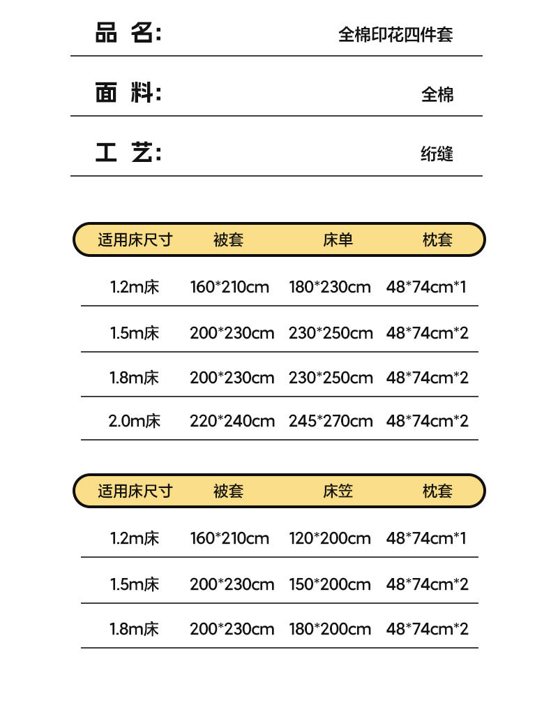| Dimensions | 1.2m bed sheet three-piece set [applicable to quilt core 150*200cm],1.5m bed sheet four-piece set [applicable to quilt core 200*230cm],1.8m bed sheet four-piece set [applicable to quilt core 200*230cm],2.0m bed sheet four-piece set [applicable to quilt core 220*240cm],1.5m fitted sheet set of four (applicable to quilt core 200*230cm),1.8m fitted sheet set of four (applicable to quilt core 200*230cm),160x210cm single quilt cover,200x230cm single quilt cover,220x240cm single quilt cover |