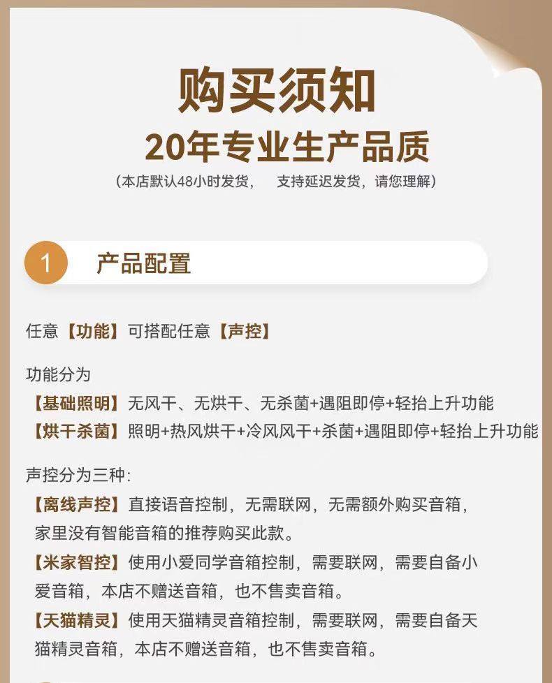 | Specification | Double light encryption intelligent remote control lifting model (a10),Double light encryption smart remote control lift + voice control model (a10),Double light encryption smart remote control lift + mijia xiaoai model (a10),Double light encryption smart remote control lift + tmall elf model (a10),Double lamp encrypted smart remote control air drying model (a10),Dual-light encrypted smart remote control air drying + voice control model (a10),Double light encryption smart remote control air drying + mijia xiaoai model (a10),Double light encryption smart remote control air drying + tmall elf model (a10),Double lamp encrypted smart remote control drying model (a10),Dual-light encrypted smart remote control drying + voice control model (a10),Double light encrypted smart remote control drying + mijia xiaoai model (a10),Double lamp encrypted smart remote control drying + tmall elf model (a10) |